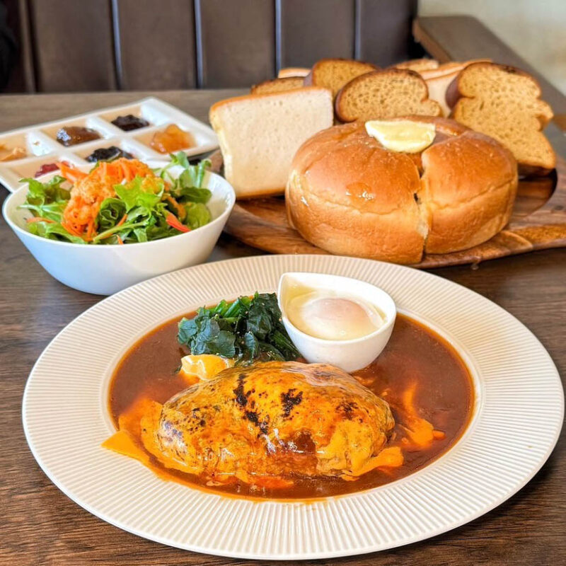 古民家をリノベーションした雰囲気のあるお店で、平日でも行列ができるほど人気のパン食べ放題ランチが楽しめます。