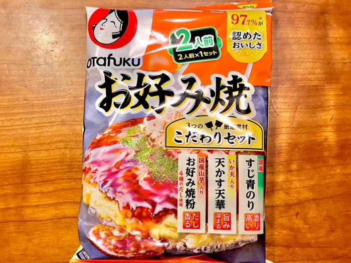袋の中にはお好み焼用の粉・天かす・青のりが入っていた。豚肉やキャベツなどの生鮮食品系の材料を用意すれば、あっという間にお好み焼きを作ることができる。