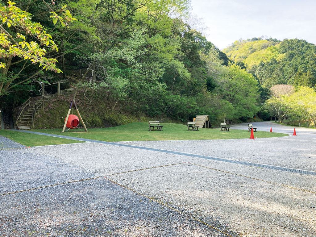 2024年4月に大駐車場に設置された、みのむしベンチと三角ログハウス(小)。ボール遊びは林間広場のみOK、硬いボールは不可。