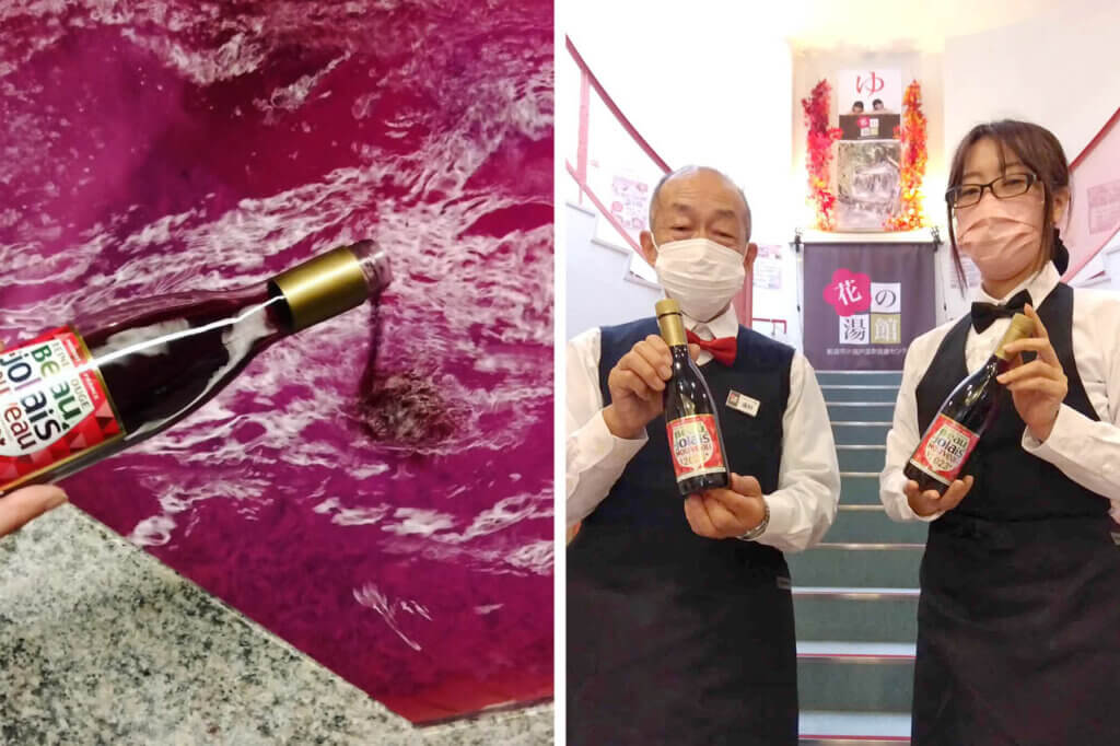 11月20日(木)のボジョレー・ヌーボー解禁に合わせて、新潟市小須戸温泉健康センター 花の湯館で開催される恒例の「ワイン風呂」。ソムリエに扮(ふん)したスタッフがボジョレー・ヌーボーを湯船に投入するパフォーマンスも。入浴しながらワインの香りを楽しめます。また、ボジョレー・ヌーボーを含ませた泥パックを浴室内で配布します。