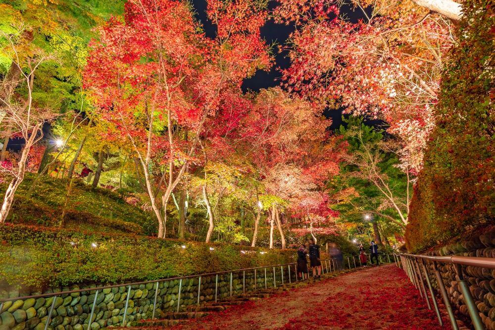 紅葉名所として名高く、毎年多くの観光客が訪れる松雲山荘。夜はライトアップされたモミジが夜空に深紅のトンネルを描き、まるで別世界のような優美な情景に出会えます。今年は週末限定(11/15・16、22・23)で、庭園の一部に和傘を設置。新しいフォトスポットに出会えます。