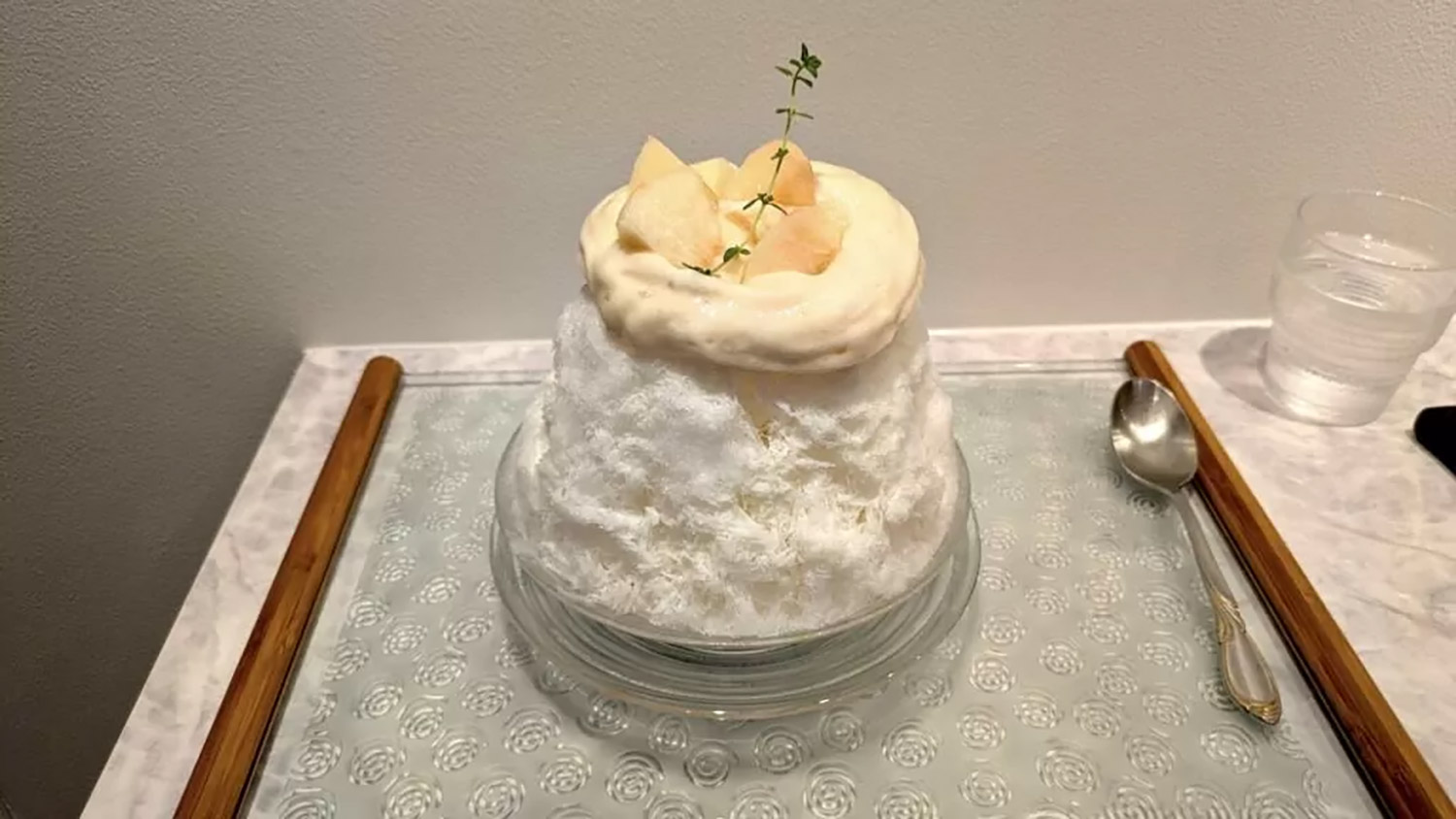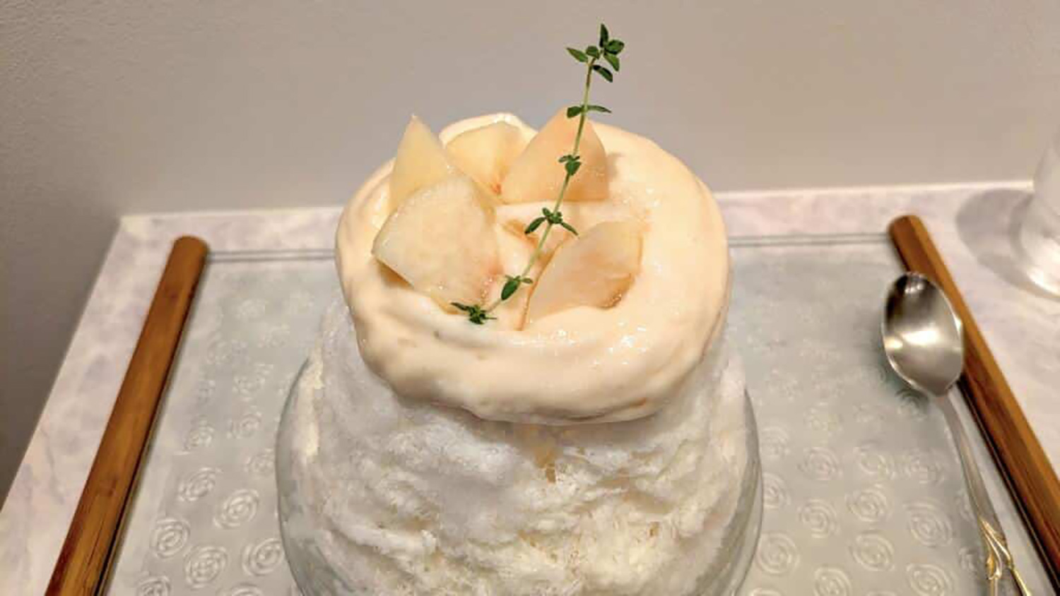 ふわふわの氷の上には、自家製のピューレを使ったエスプーマ。さらにフレッシュな桃がのっています。