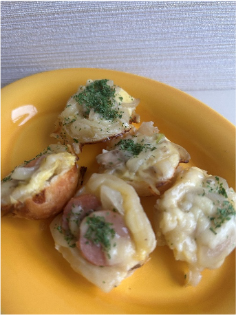 ⑦ ピザ用チーズが溶けて、中まで火が通ったら皿に盛りつけ、ドライパセリを振る。