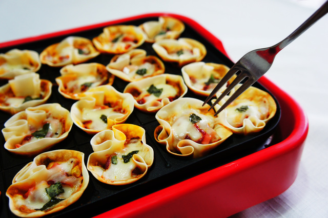 たこ焼き器に餃子の皮を置くときは、やけどに十分注意しましょう。赤と緑のピーマンを刻んで入れて焼き上げれば、クリスマスカラーの一口ピザができあがります。