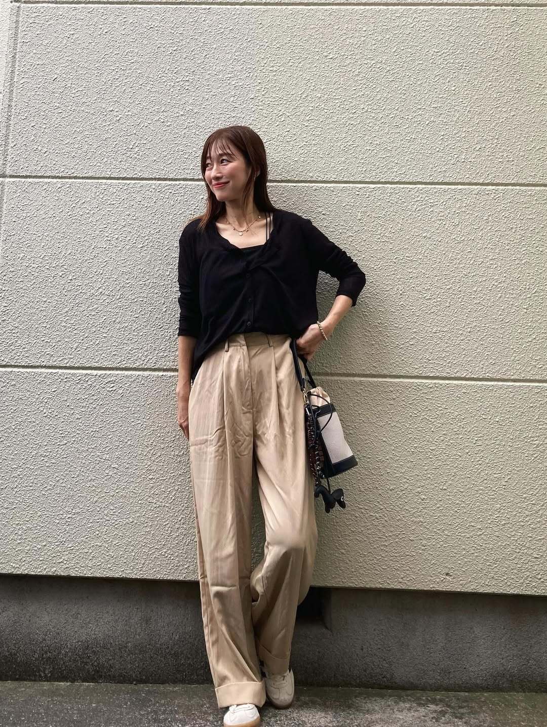 ベージュパンツは、黒トップスと合わせるだけで、簡単に大人っぽく決まる万能アイテムです。