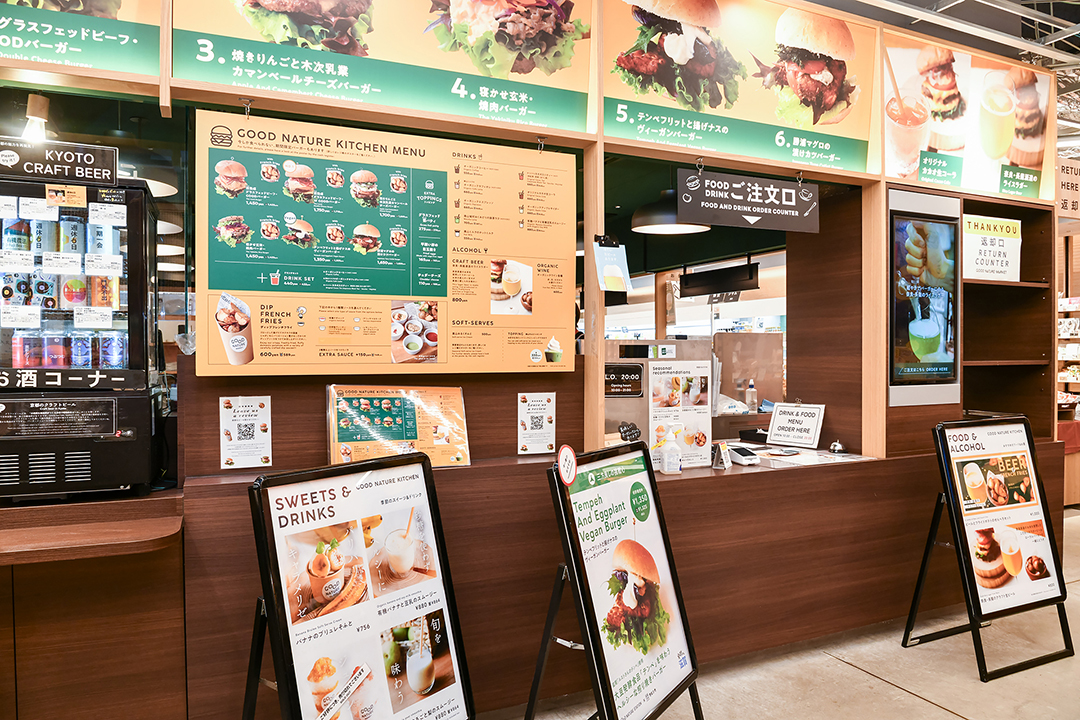 マーケットには、パティを焼く音やフレンチフライの香りが漂い食欲をそそる。ドリンクには、マーケットでも販売している「GOOD NATURE STATION」オリジナルの「カカオ生コーラ」や「カカオ入りティー」、クラフトビールやオーガニックワインなど、多彩なラインナップが揃う。イートインスペースで、バーガーとともにゆったり味わえるのも魅力のひとつ。