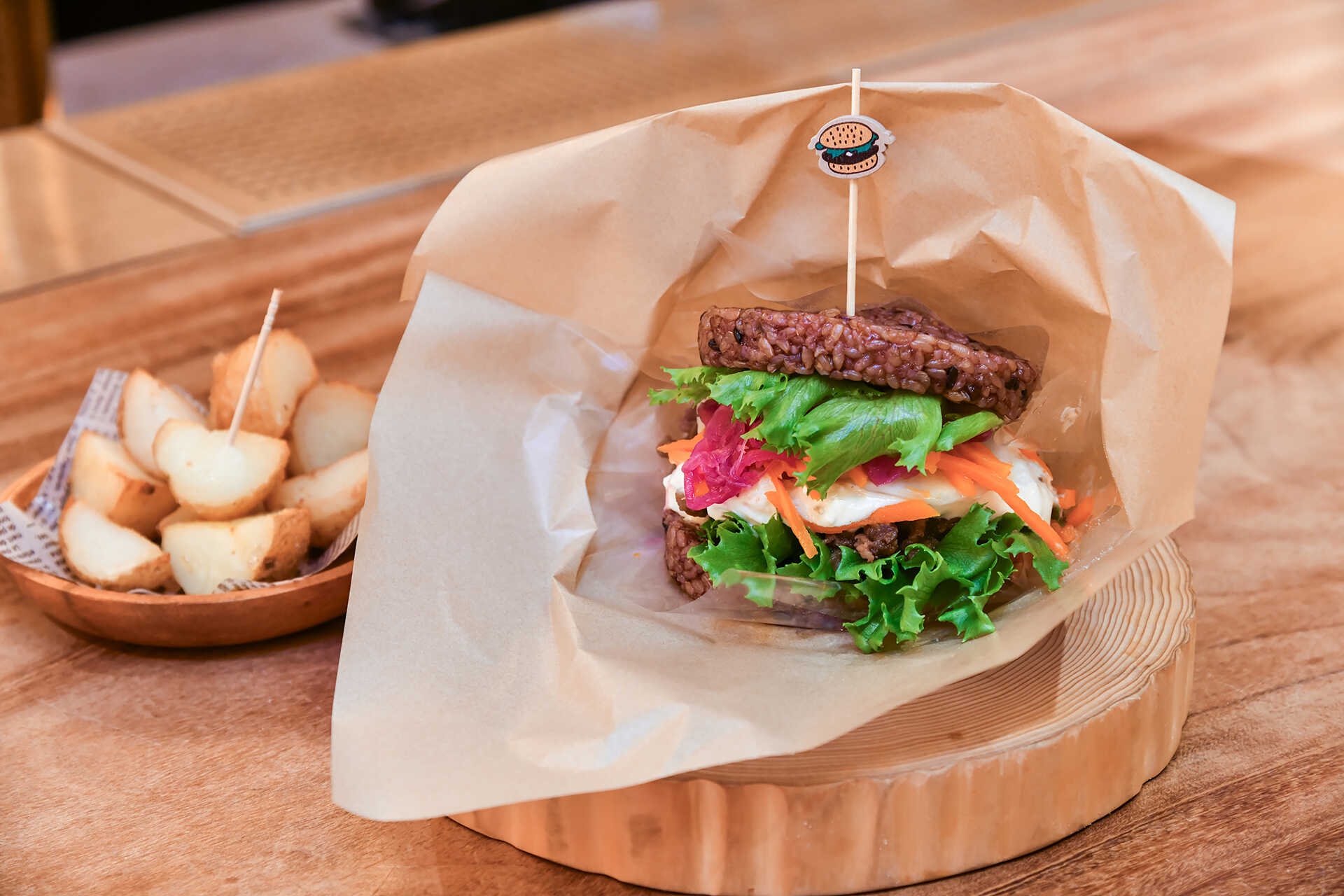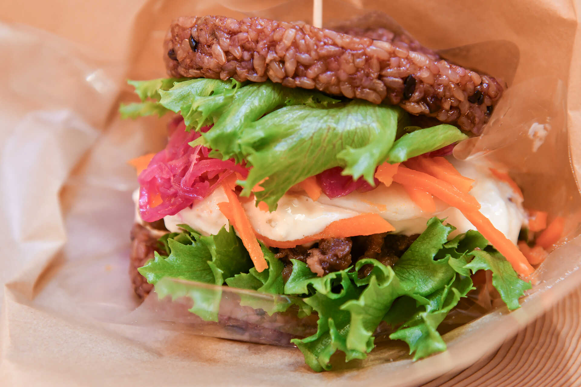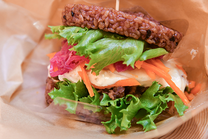 今回注目するのは「寝かせ玄米®・焼肉バーガー」。マーケットでも人気の「YUWAERU」の寝かせ玄米を蒸して成形し、バンズに仕立てたシリーズ唯一のライスバーガー。寝かせ玄米はもっちりとした食感で滋味深い味わい。ビタミンやミネラル、食物繊維も豊富で、噛むほどに自然の力強さが感じられる。