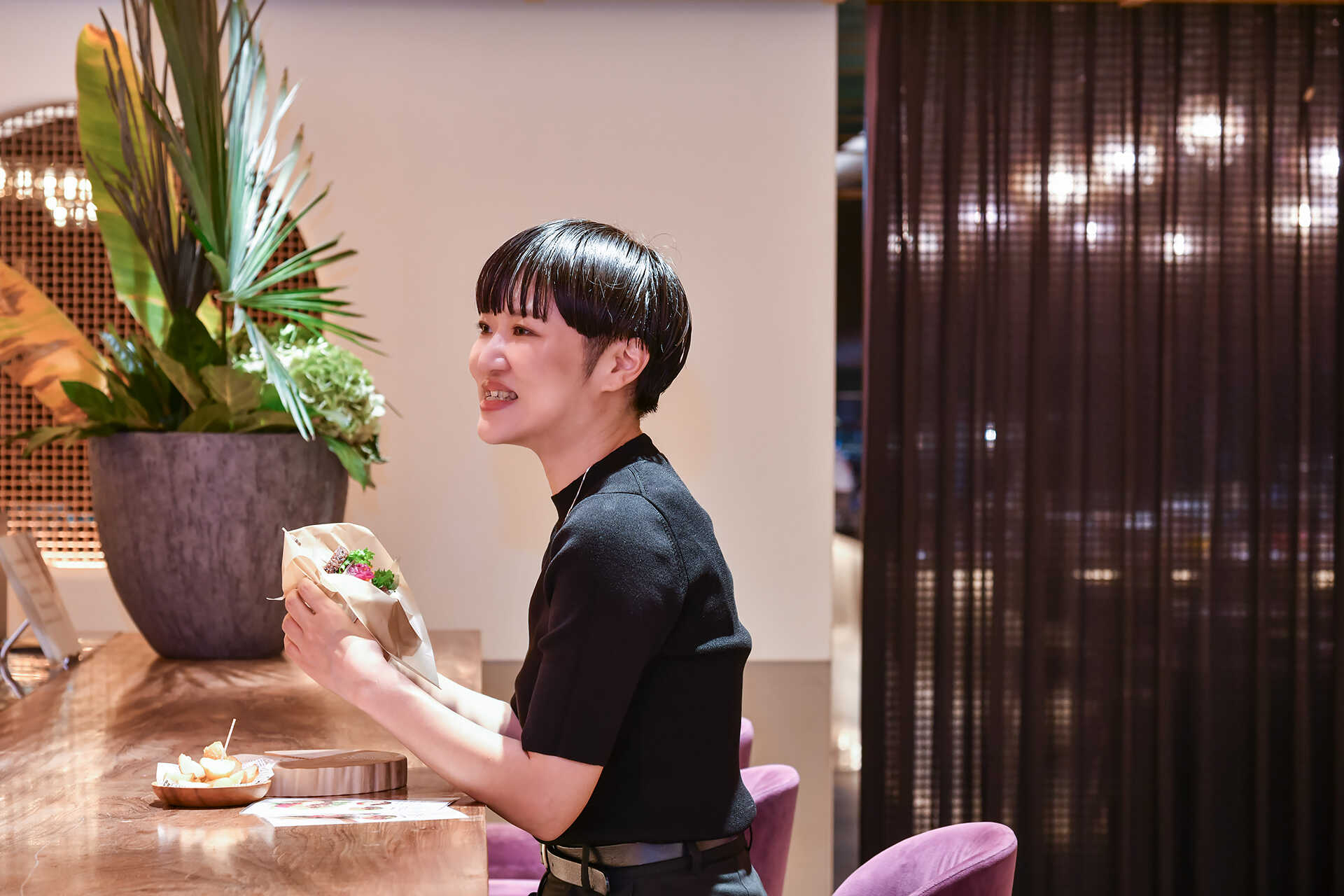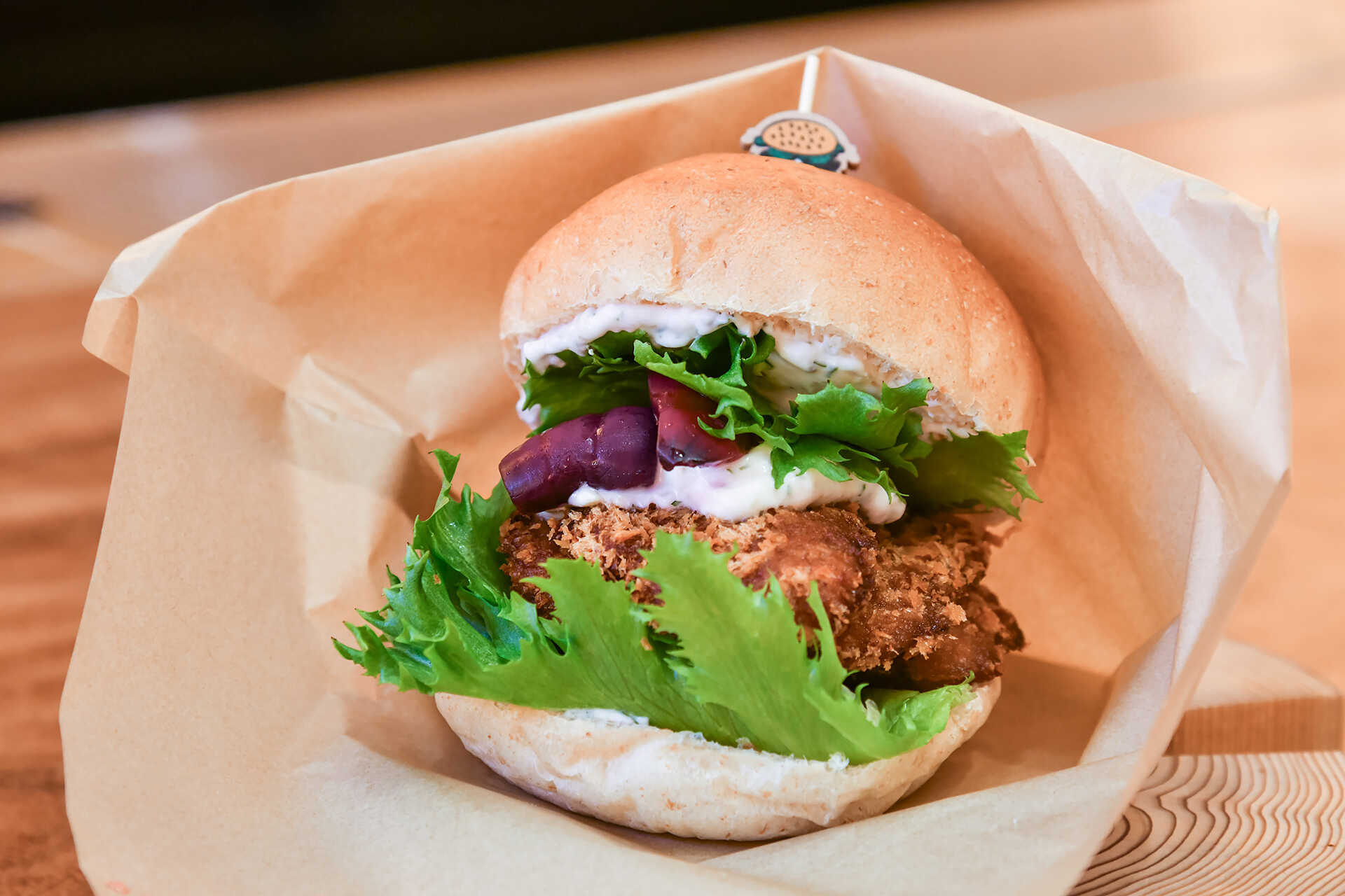 バンズもまた、印象的な味わい。全粒粉と太白ゴマ油で作るヴィーガン仕様で、ひきのある生地はほんのり甘みも感じる。「勝浦マグロの漬けカツバーガー」には、蒸して仕上げることでふんわりとした口あたりに。カツのサクサク食感とのコントラストが心地よく、具材の魅力を最後のひと口まで引き立てている。