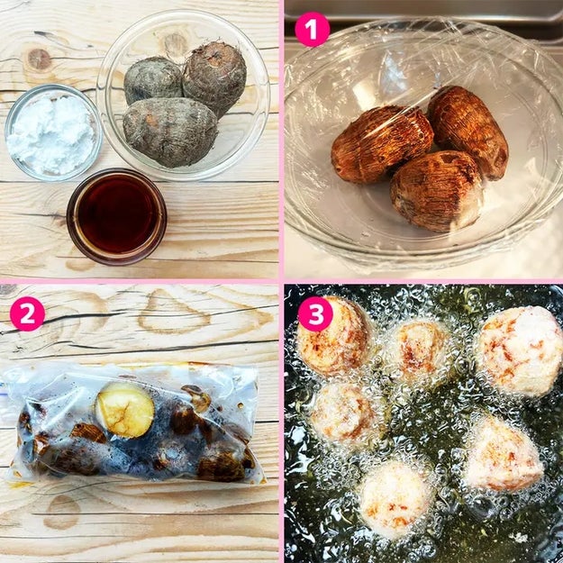 ① 里芋はよく洗い、耐熱ボウルに入れてラップをかぶせ、600Wの電子レンジで3分加熱する。