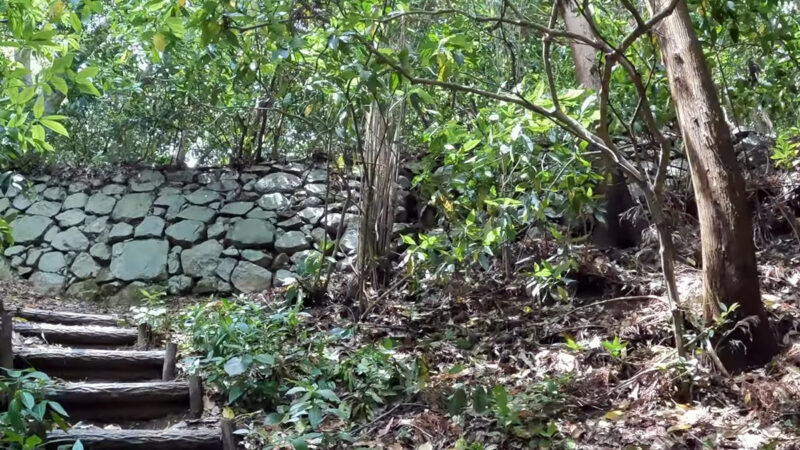 城は、四王寺山の尾根を利用して築かれ、石垣や土塁、門跡などが残っている。