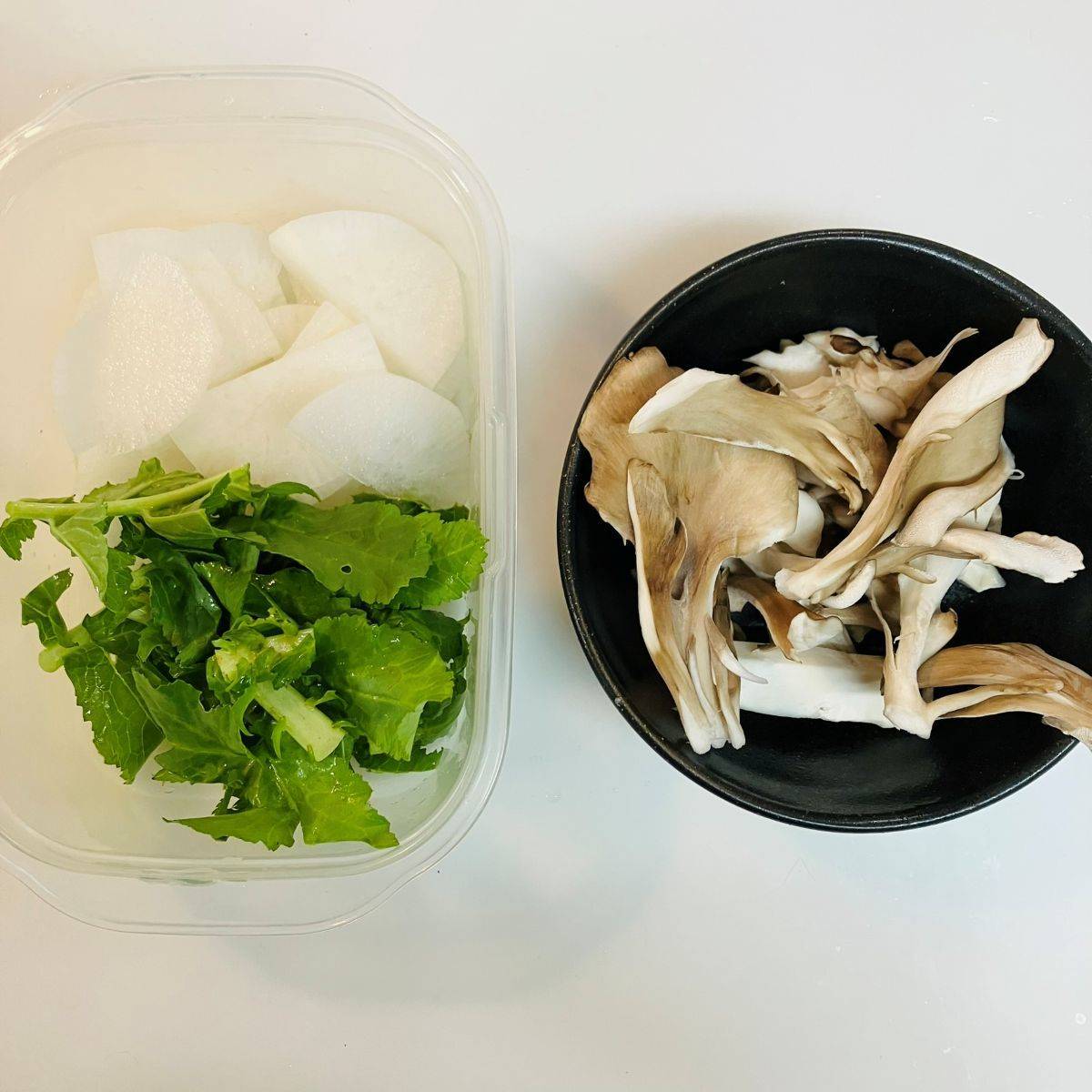 大根は厚さ5mmの半月切りにし、葉も2〜3cmほどに切っておきます。