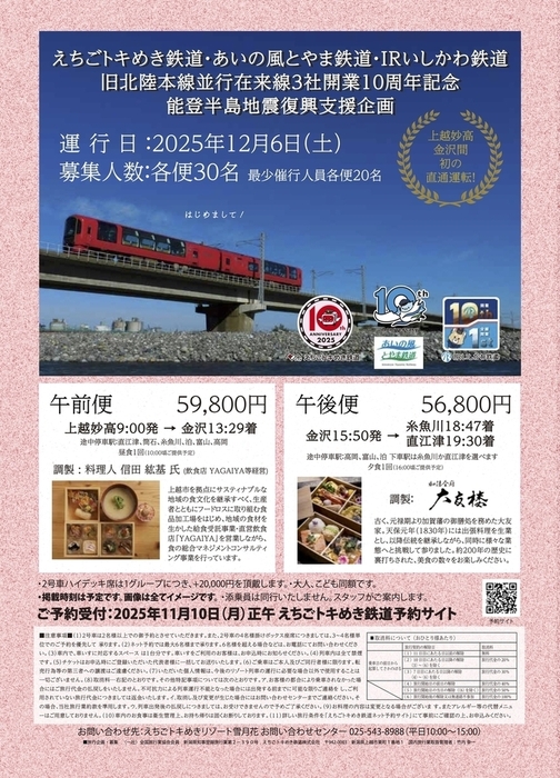 料金は上越妙高発の午前便が5万9800円、金沢発の午後便は5万6800円。定員は各便30人で、10日正午からトキ鉄予約サイト( https://reservation.echigo-tokimeki.co.jp/ )で予約を受け付ける。