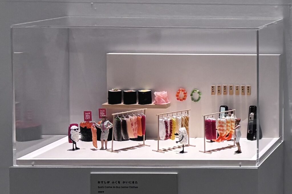 人気絵本[おすしが ふくを かいにきた]のミニチュア展示も。おすしの買い物風景を、絵本とは別の角度からも覗いてみて 田中氏はミニチュア作品を、なんと2011年からSNSに毎日投稿しているというから驚き。「どうしてアイデアが尽きないのか?」また、「発想はどこからくるのか?」。『田中達也展 みたてのくみたて』では、その答えを知ることができます。