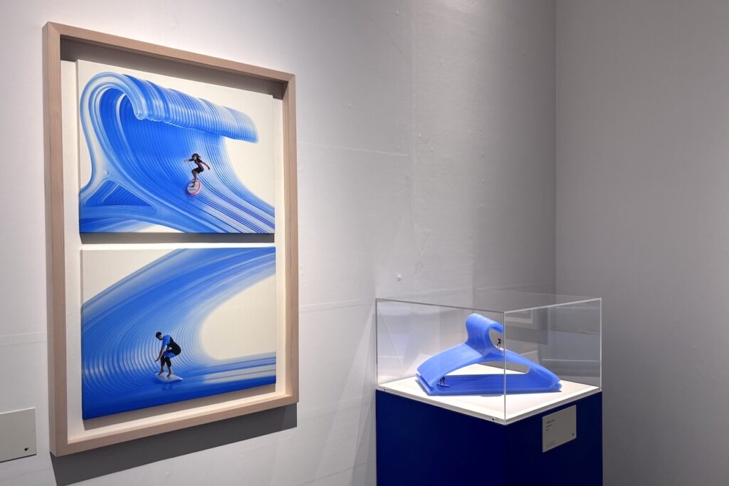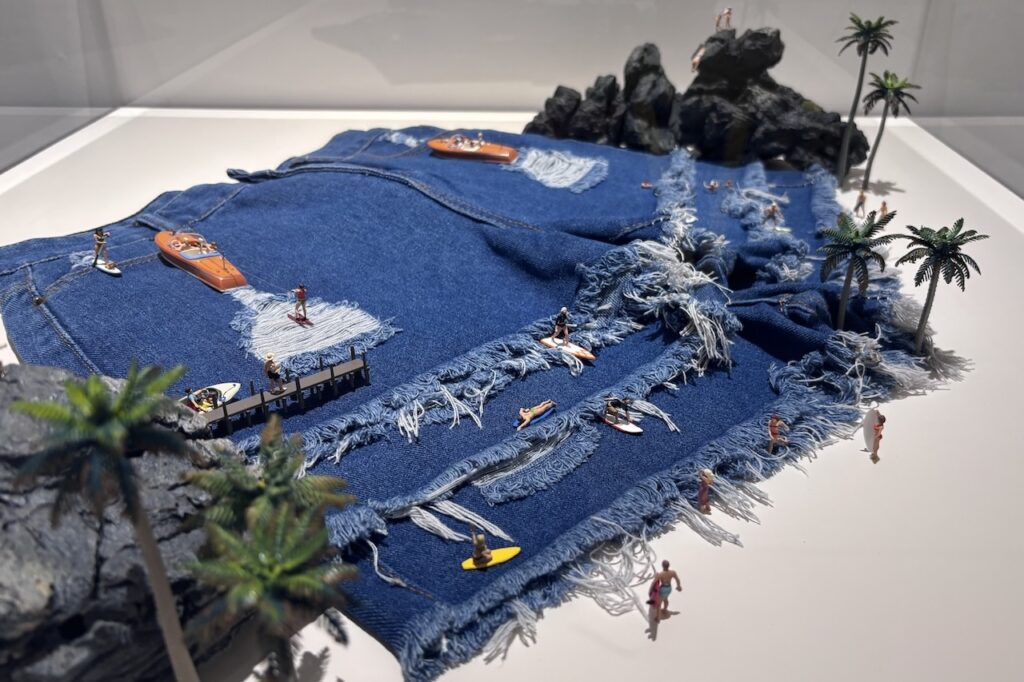 HOME・FORM・COLOR・SCALE・MOTION・LIFE・WORLDと7つのゾーンに分かれており、それぞれの角度から田中達也氏の発想の秘密を解き明かせます。例えばCOLORゾーンは、色から着想を得た作品を展示。青といえば海、デニム、ミントアイスなど、連想して見立てのモチーフを探すのだとか。「西海岸ではなく腰海岸(ウエストコースト)」という作品では、デニムのショートパンツを波打ち際に見立てています。