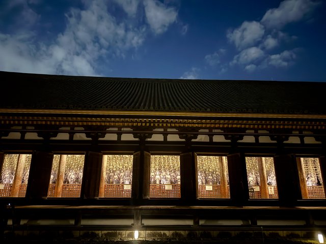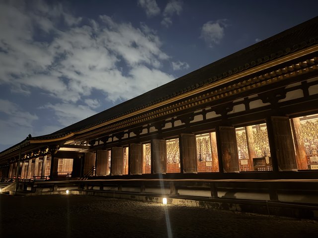本堂内への立ち入りは禁止で、区画内からの拝観のみとなりますが、それでも非常に貴重な機会です。障子は全て開放され、東庭からの夜景拝観が可能に。温かな光に照らされた千手観音坐像は圧巻で、思わず息を呑むほどの迫力でした。