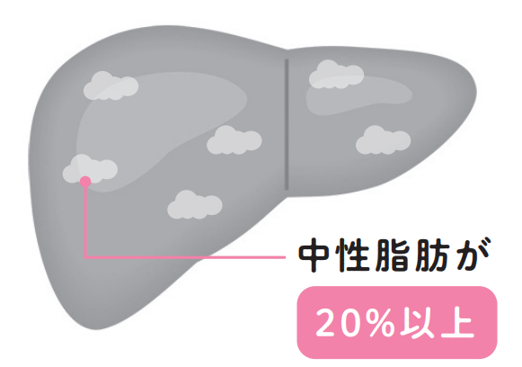 「脂肪肝」とは、肝臓に中性脂肪がたまりすぎた状態のこと。健康な人の肝臓にも3~5%の中性脂肪が存在しますが、それが増加して20%を超えると脂肪肝と呼ばれる状態になります。