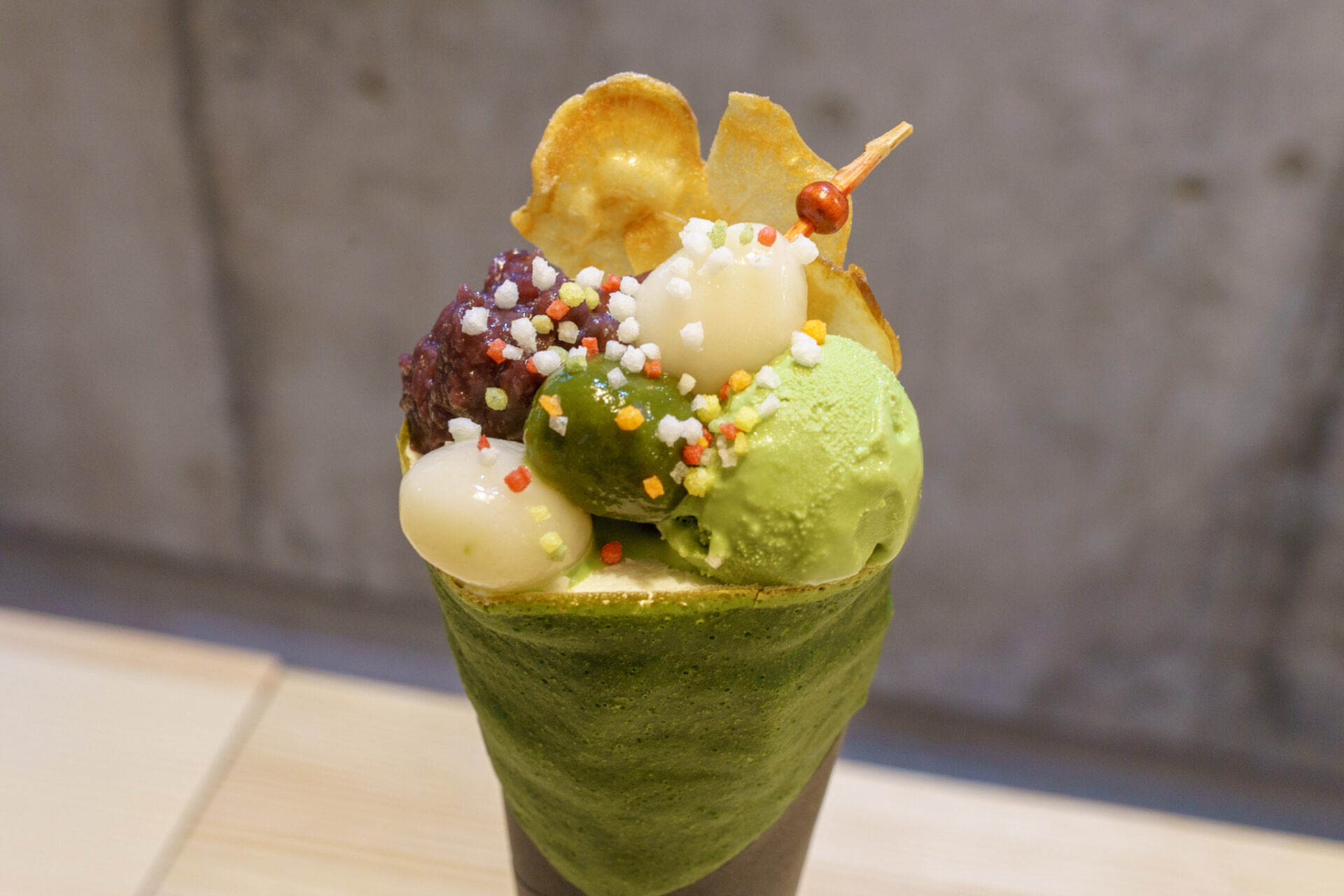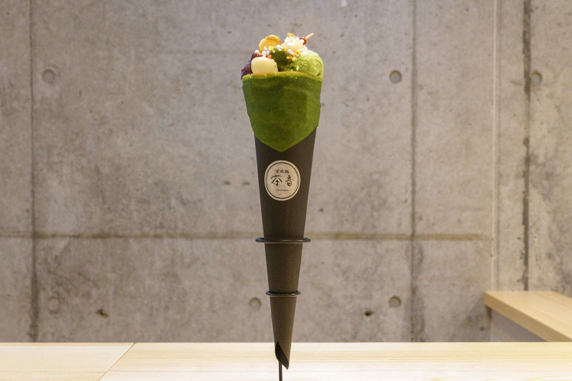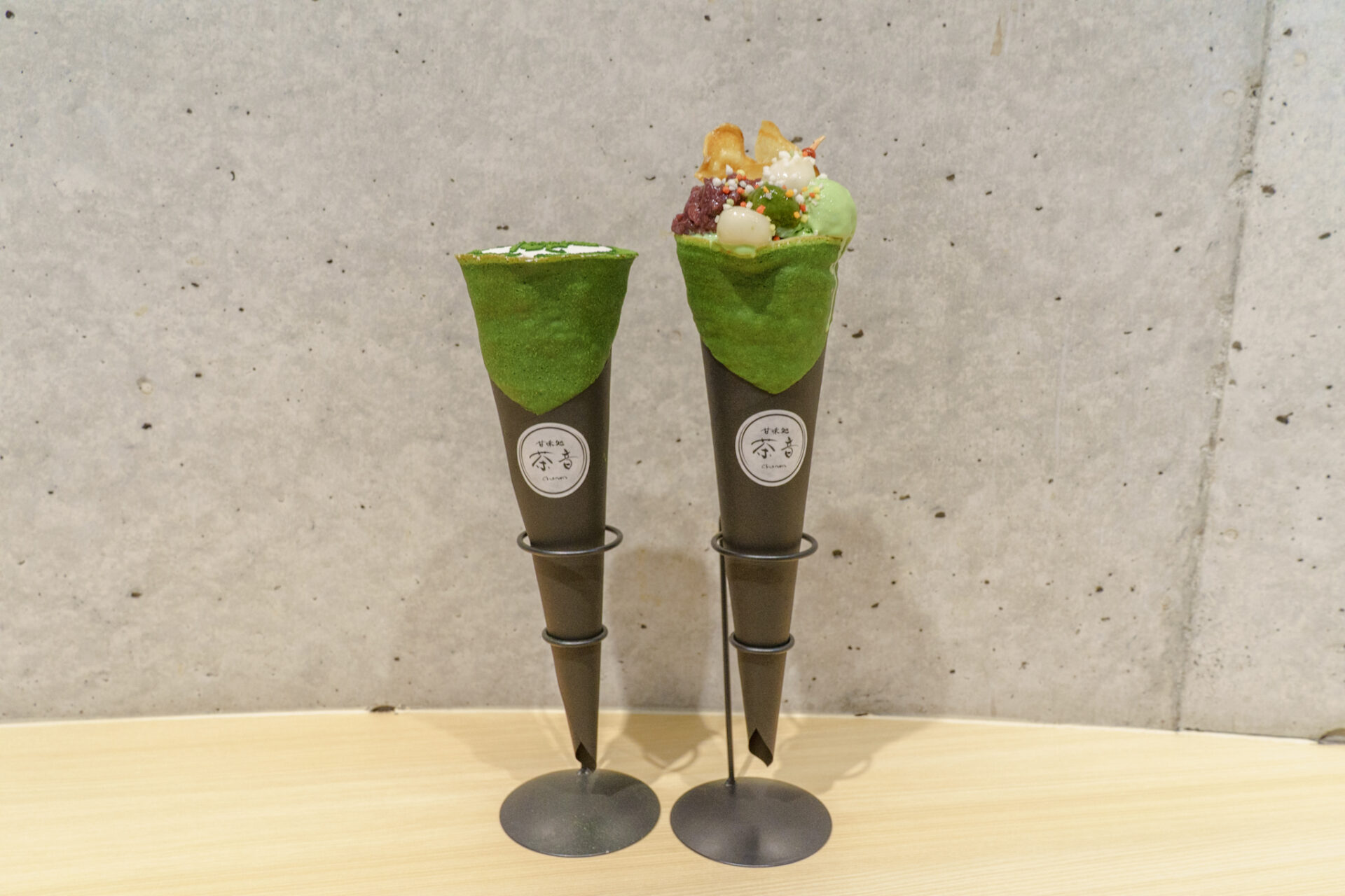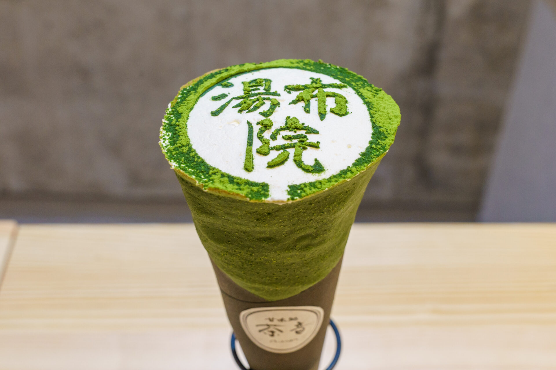 抹茶クレープは、湯布院の文字が印象的な「湯布院ティラミス」、白玉だんごが乗った「色スペシャル」、「抹茶ブリュレ」があります。