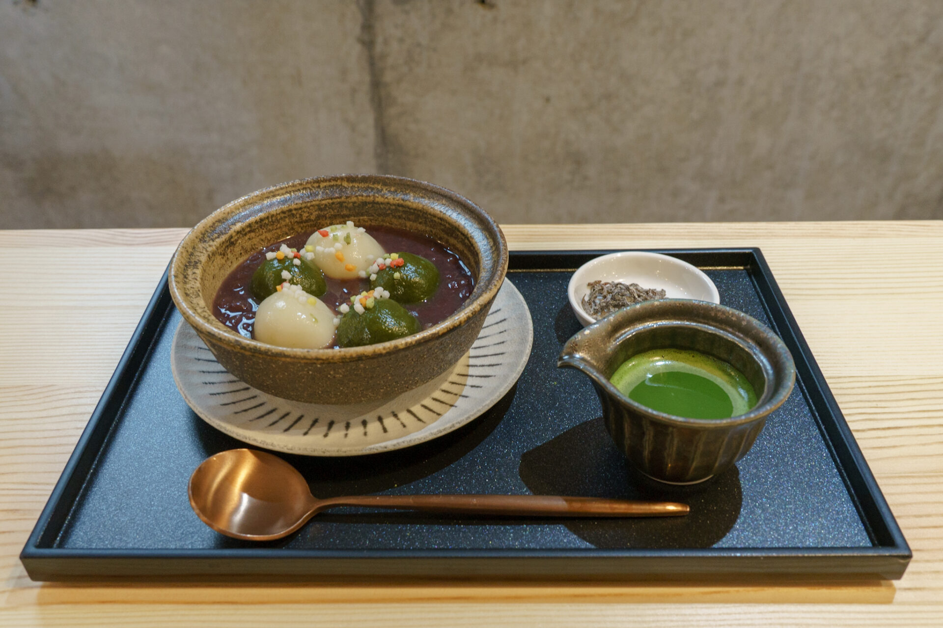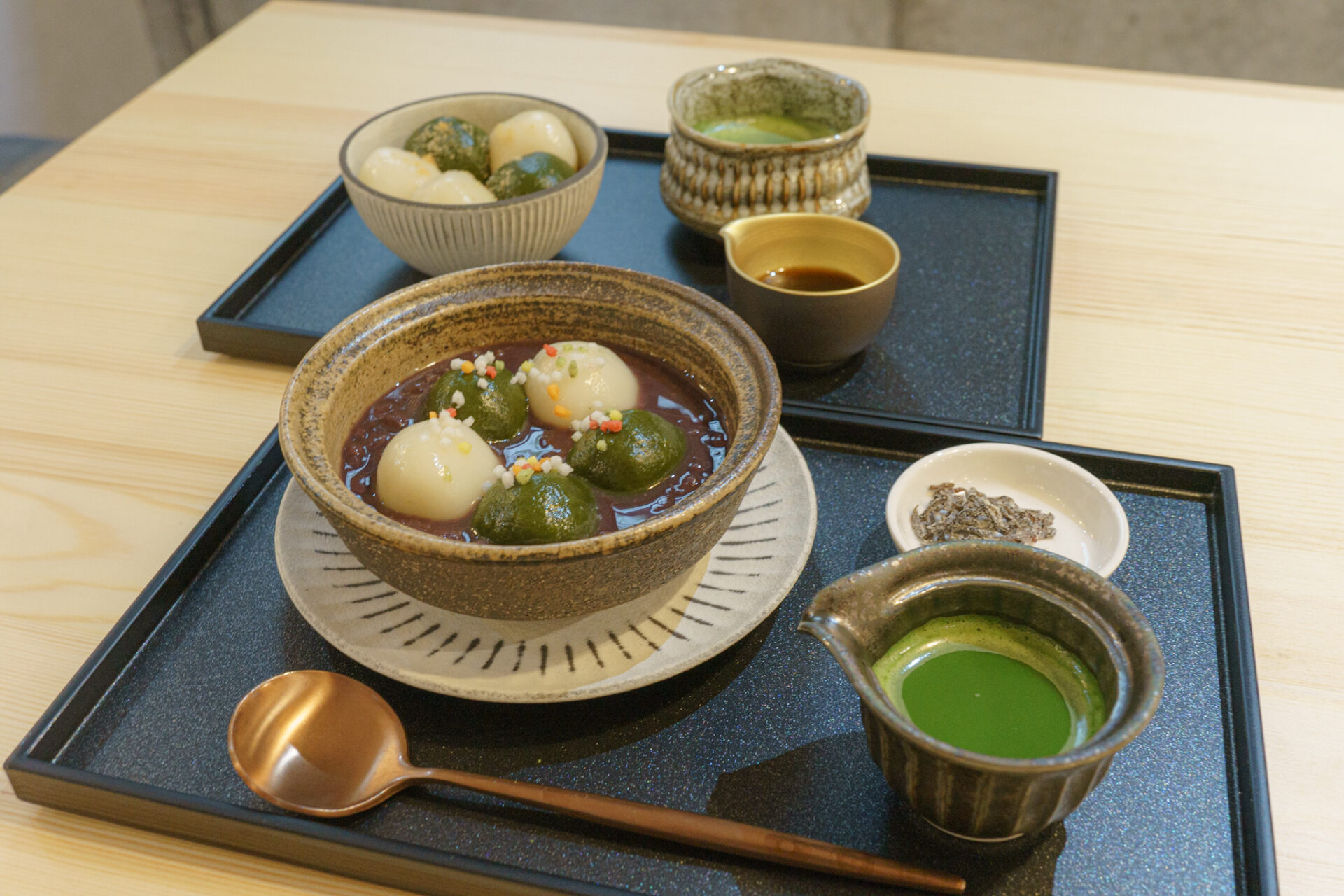 『知覧抹茶ぜんざい』は、ぜんざいの上から、濃く立てた抹茶をかけていただく一品。