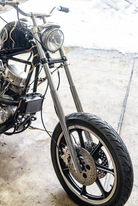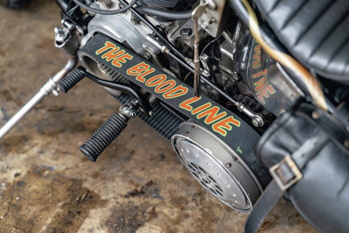 エキゾーストはハイパイプのサンダーヘッダーを装備。スポーツスタータンクはチョップしてナロードして、タンクキャップをリロケート。フレイムスやスカルはペイントショップイザナイの仕事。オープンプライマリー化して、BDL強化クラッチ、Baker6速ミッションを搭載。エンジンパフォーマンスに合わせてアップデートされている。