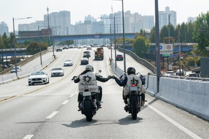 チョッパーに荷物を縛り付けて全国を走り回る。下は韓国SHAKE PISTONのGさんを訪ね、釜山〜清州〜ソウルを走った際の一葉。「バイクで知り合った仲間と新たな街を走る。出会いもトラブルも含めてすべてを楽しめる乗り物です」
