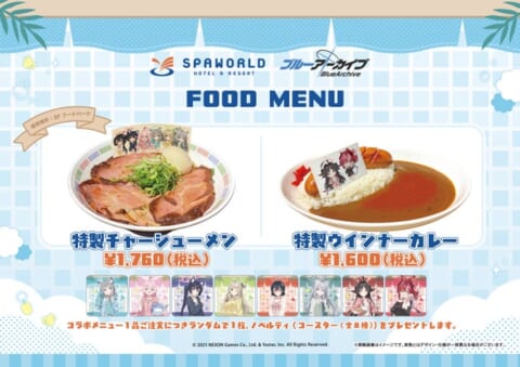 イベント期間中、SPAWORLD館内フードエリアにて『ブルーアーカイブ』とのコラボレーションメニューが販売されます。コラボメニューを1品注文するごとに、ランダムで1枚のノベルティが進呈されます。