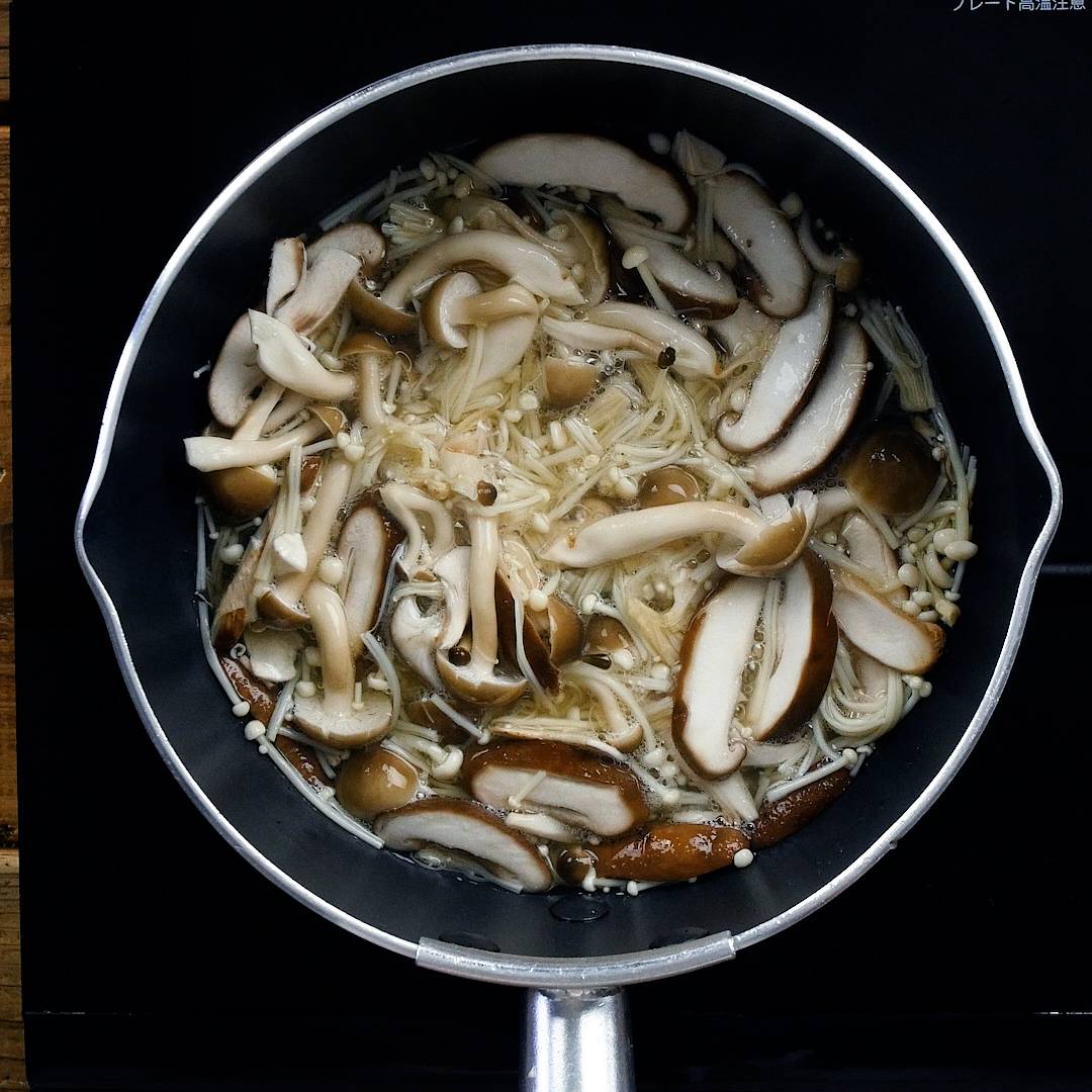 2: 鍋に (a) を入れてひと煮立ちさせたら、①のきのこ類を加えます。