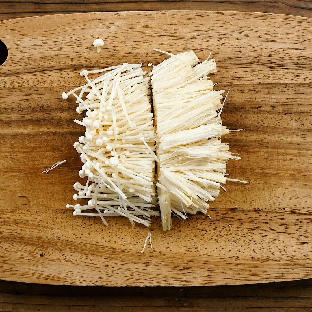 1: しいたけは傘を5mm幅の薄切りに、軸を細切りにします。しめじとえのきは小房に分けます。