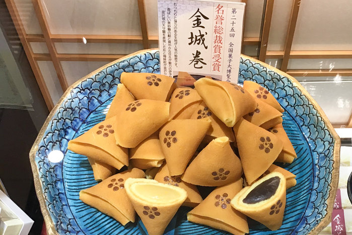 加賀藩前田家家紋「梅鉢」の焼印が目を引く「金城巻」(6個入1,144円)。