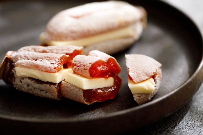 雪吊りの縄をイメージし、前田家の“梅鉢紋”から石川県産の梅酒・卵・米粉をふんだんに使い、フランス伝統菓子のサクリスタンをヒントに焼きあげたスイーツ。
