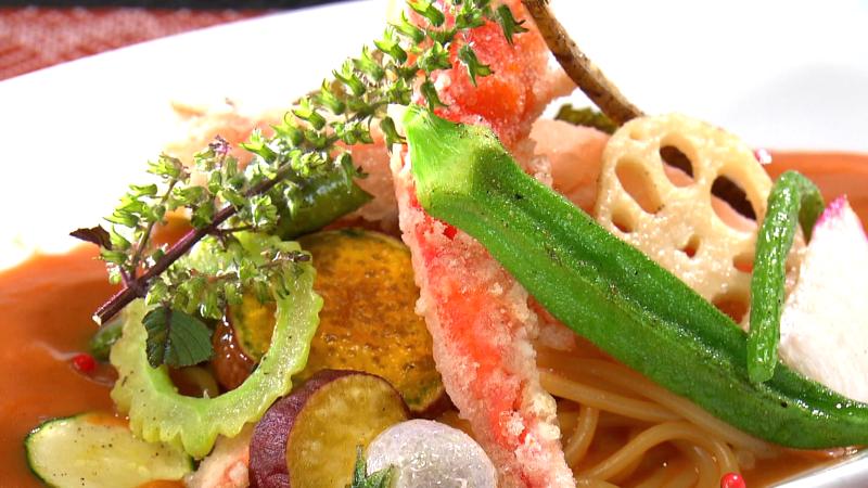 季節の野菜満載! エビをふんだんに使った生パスタ