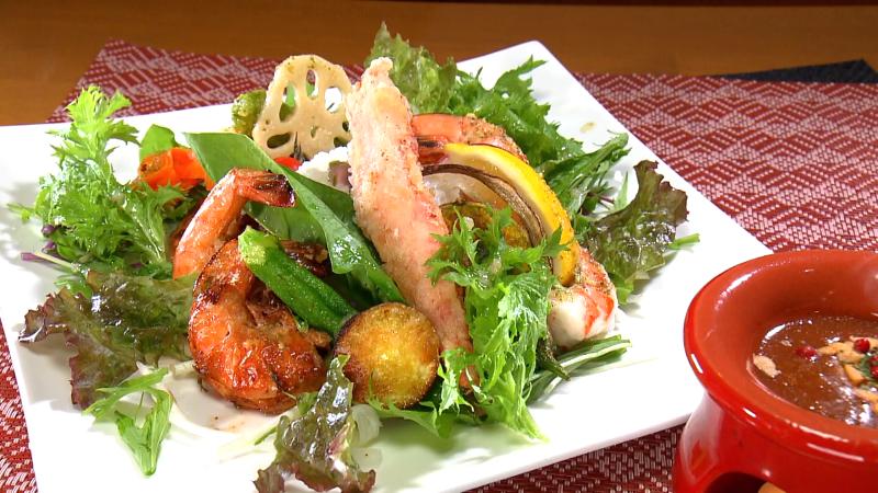 季節の野菜は、地元農家から仕入れています。レンコン、ピーナッツカボチャ、四角豆、ゴボウ、ゴーヤ、ズッキーニなど種類も豊富です。使用する野菜は季節によって異なります。