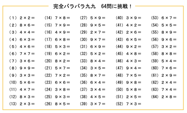 1の段と各段の×1を除いた、完全に順不同にした九九カードを使って唱えたり、64個の九九をランダムに並べた「完全バラバラ九九」プリントを使って習熟する。