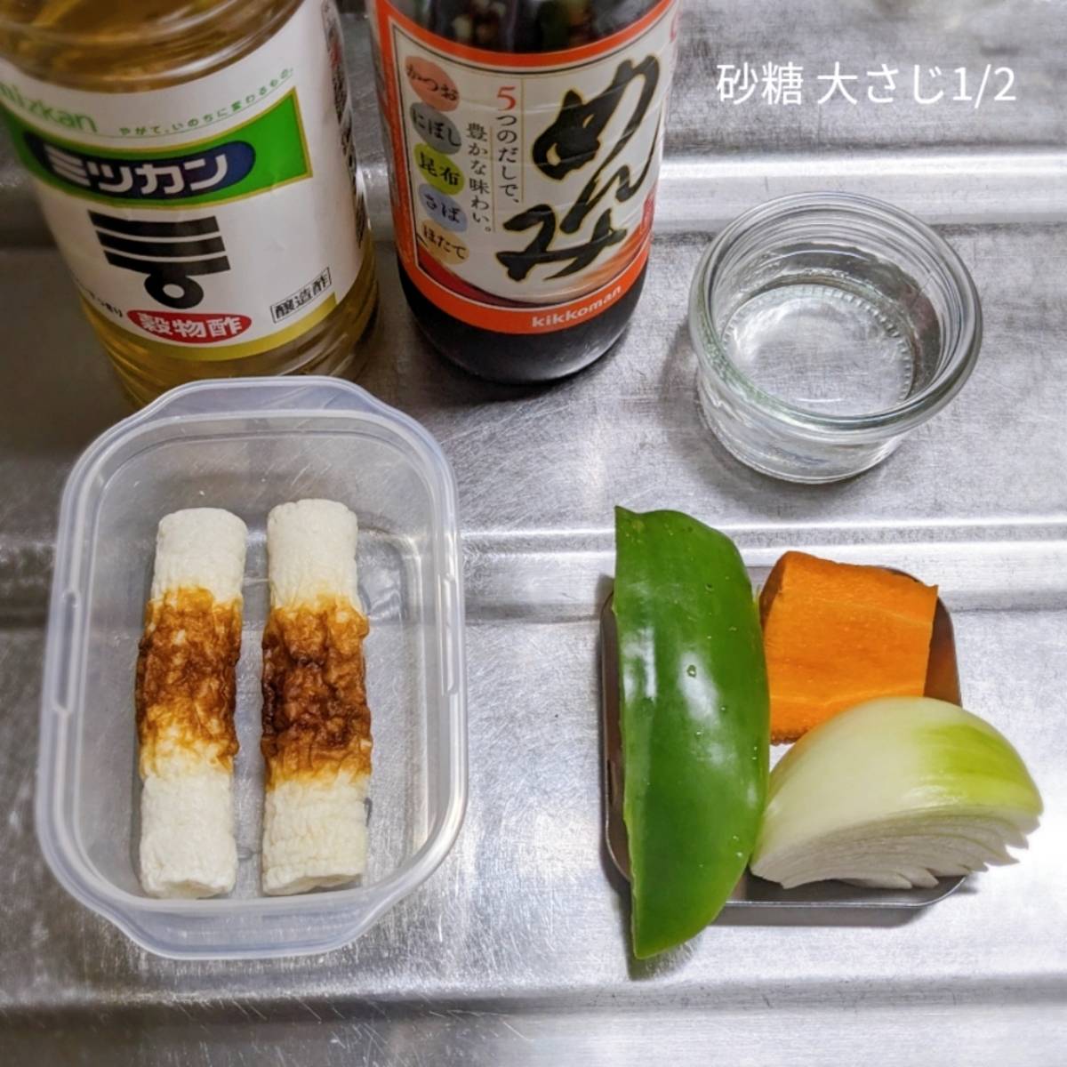 容器に、①の野菜・②のちくわ・水・めんつゆ・酢・砂糖を入れます。