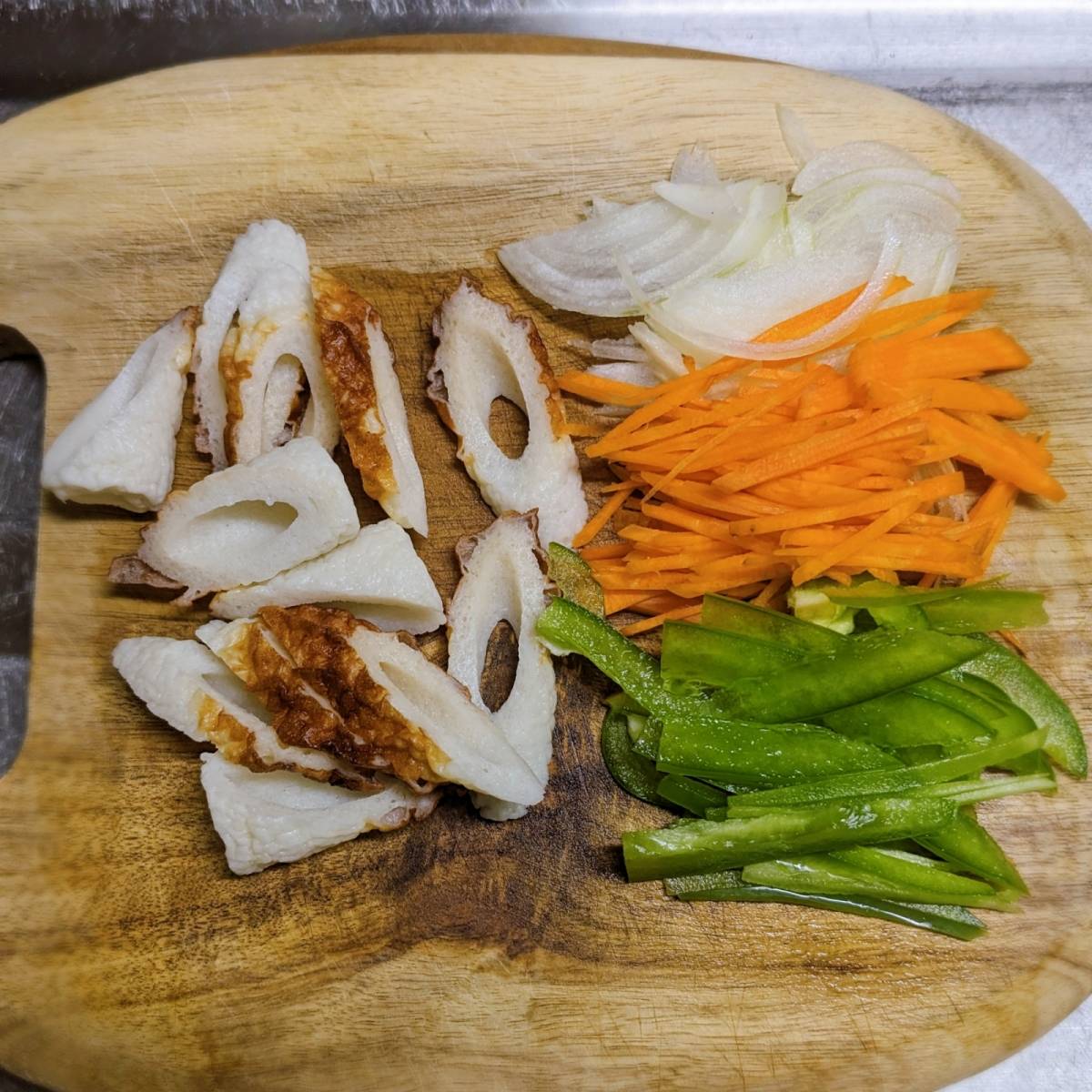 玉ねぎは薄切りに、にんじんとパプリカは千切りにしてください。