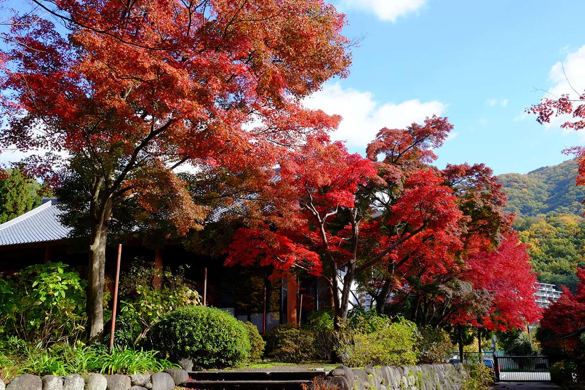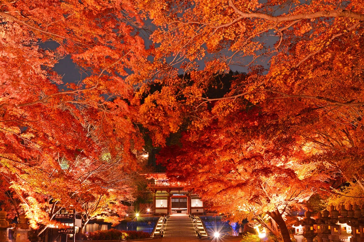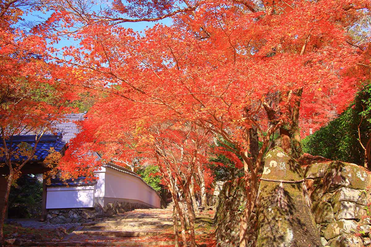 境内には約20種類、300本の鮮やかに紅葉する樹々が立ち並んでおり、例年11月初旬~12月初旬まで紅葉狩りを楽しめます。山中にあるお寺なので混雑の少ない場所でゆったり紅葉を観賞したい人におすすめ。歴史あるお寺の佇まいと彩り豊かな紅葉のコントラストは、撮影スポットとしてもぴったりです。