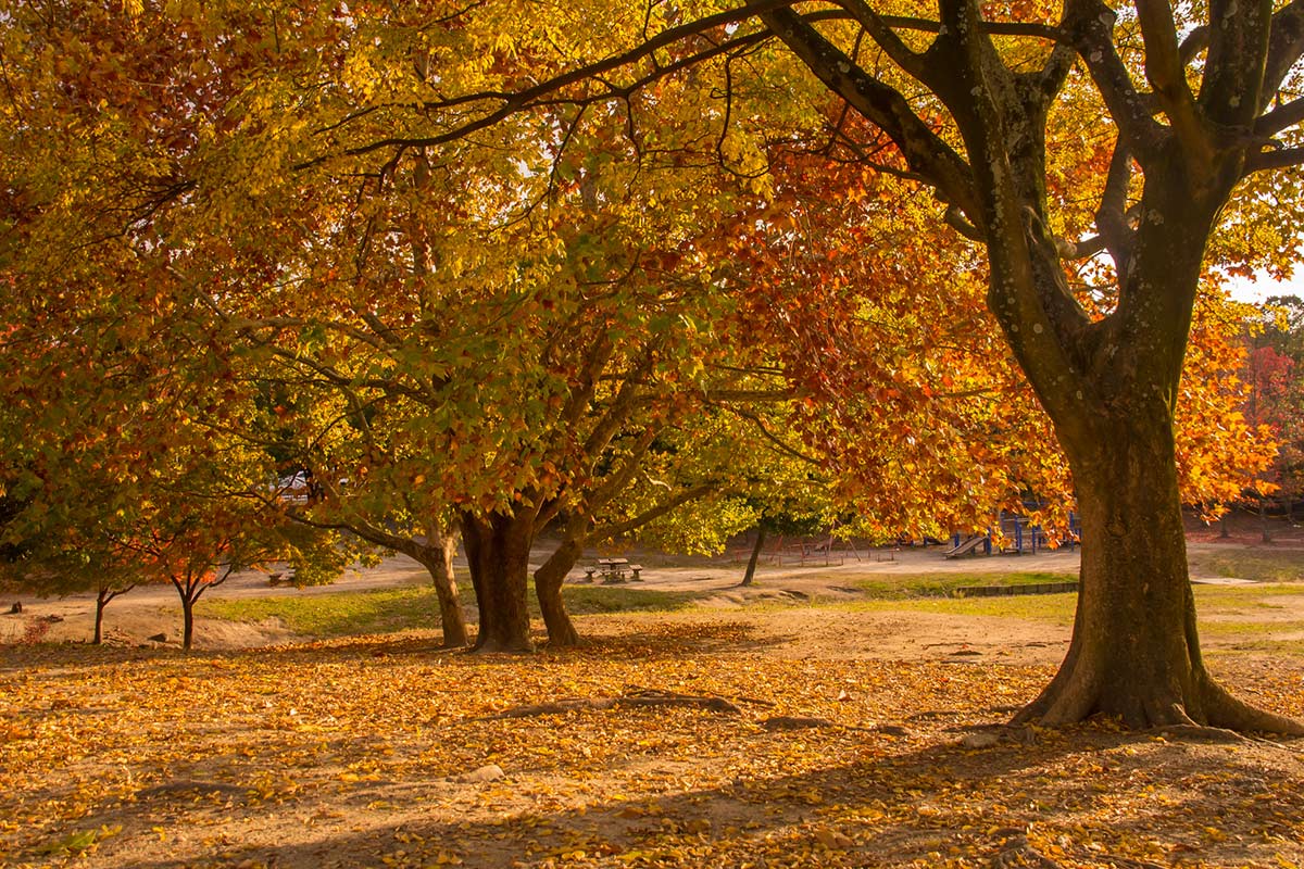 「服部緑地」(大阪府豊中市服部緑地)は、プールをはじめ植物園や博物館、野外音楽堂、バーベキュー広場などいろいろな施設を備えた広大な緑地です。多様な種類の樹々や草花が生育していて、自然豊かな公園として親しまれています。そして秋になると、園内のあちこちで赤や黄色に色づく紅葉が楽しめます。