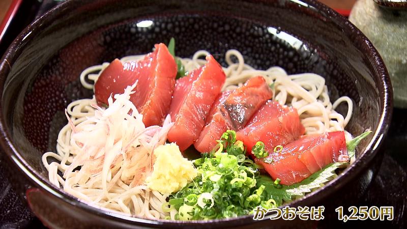 脂がのり始めた新鮮なカツオをのせた「カツオそば(1250円)」はおすすめメニューのひとつ。