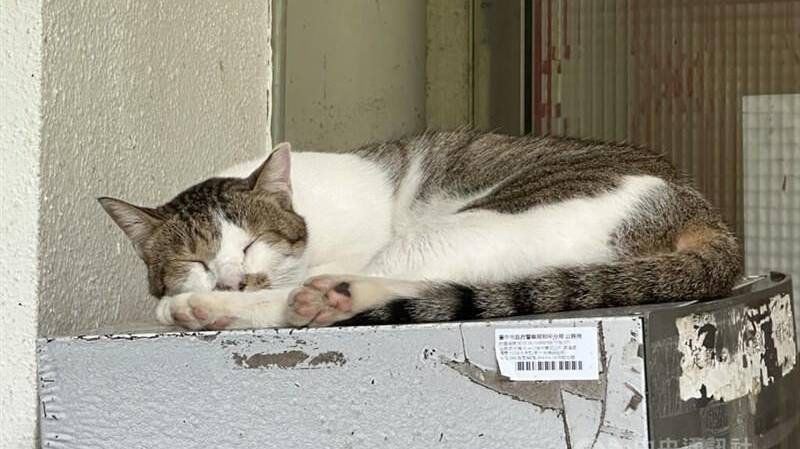茶白の子猫がジャンちゃんのおなかに手を伸ばし、ちょいちょいと右手で触ると、ジャンちゃんは少しくすぐったかったのか体をひねって向きを変えますが、それでもおなかは上を向いたままだったのだとか。