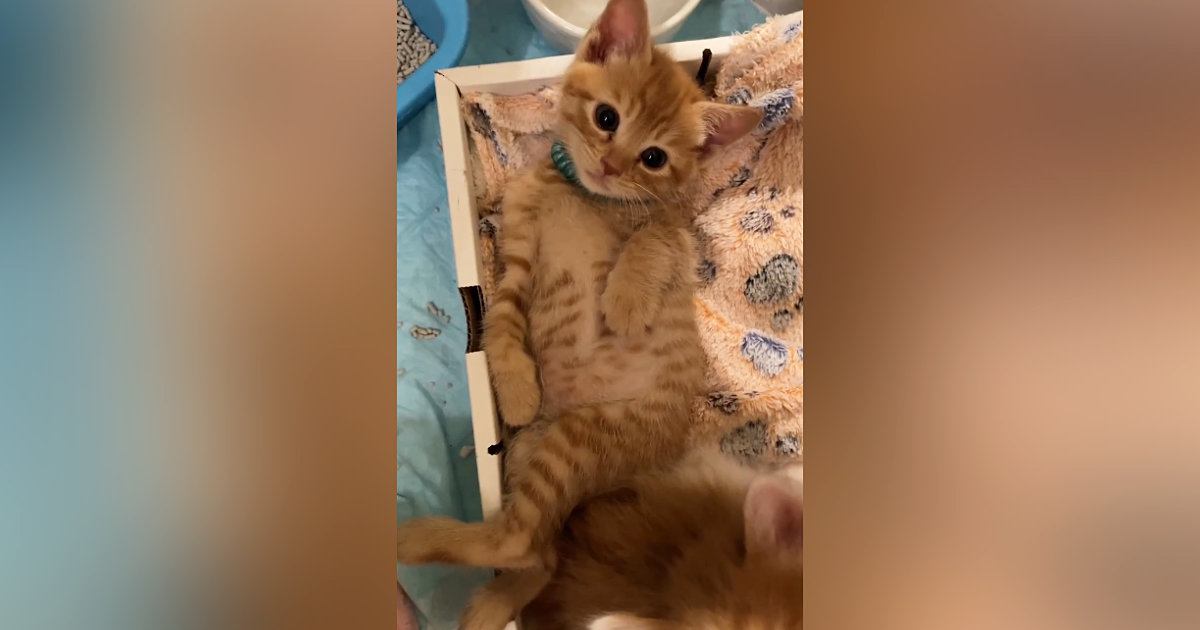仰向けの状態でくつろいでいた茶トラの子猫→くるくると体勢を変えて…思わず癒されるかわいい光景に「キュンときた」「悶絶した」と反響