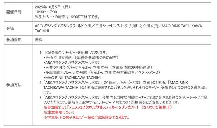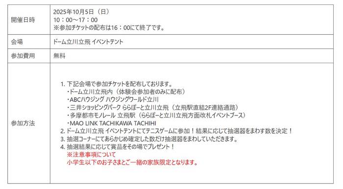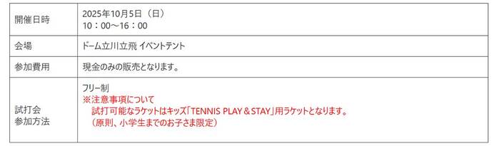 子どもと一緒に楽しめるテニスイベント!10/5(日)にドーム立川立飛ほか複数会場で「立川立飛テニスフェスタ」が開催