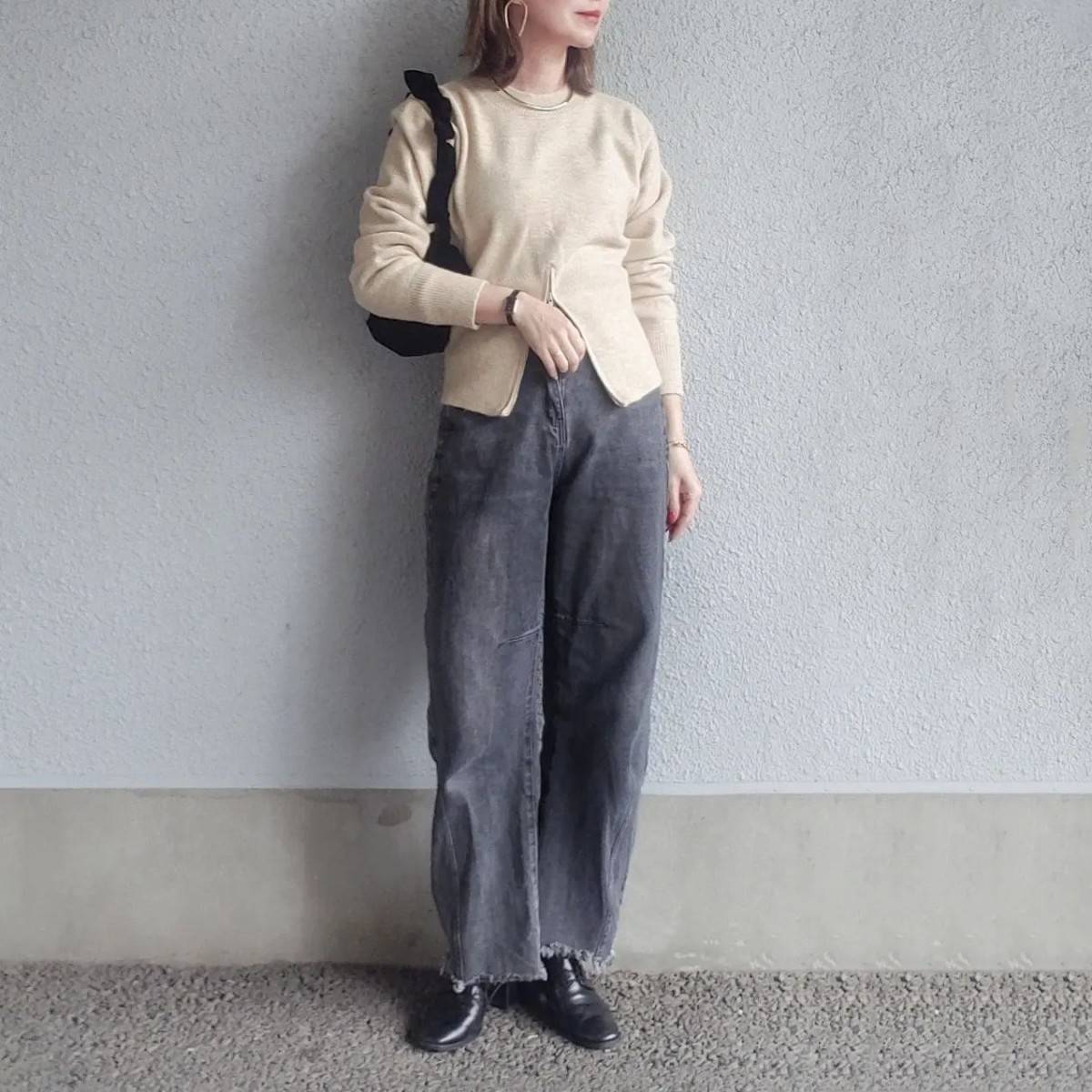 【11月編】センスいいデニムパンツコーデ①ゆるニット×ワイドデニムパンツ
