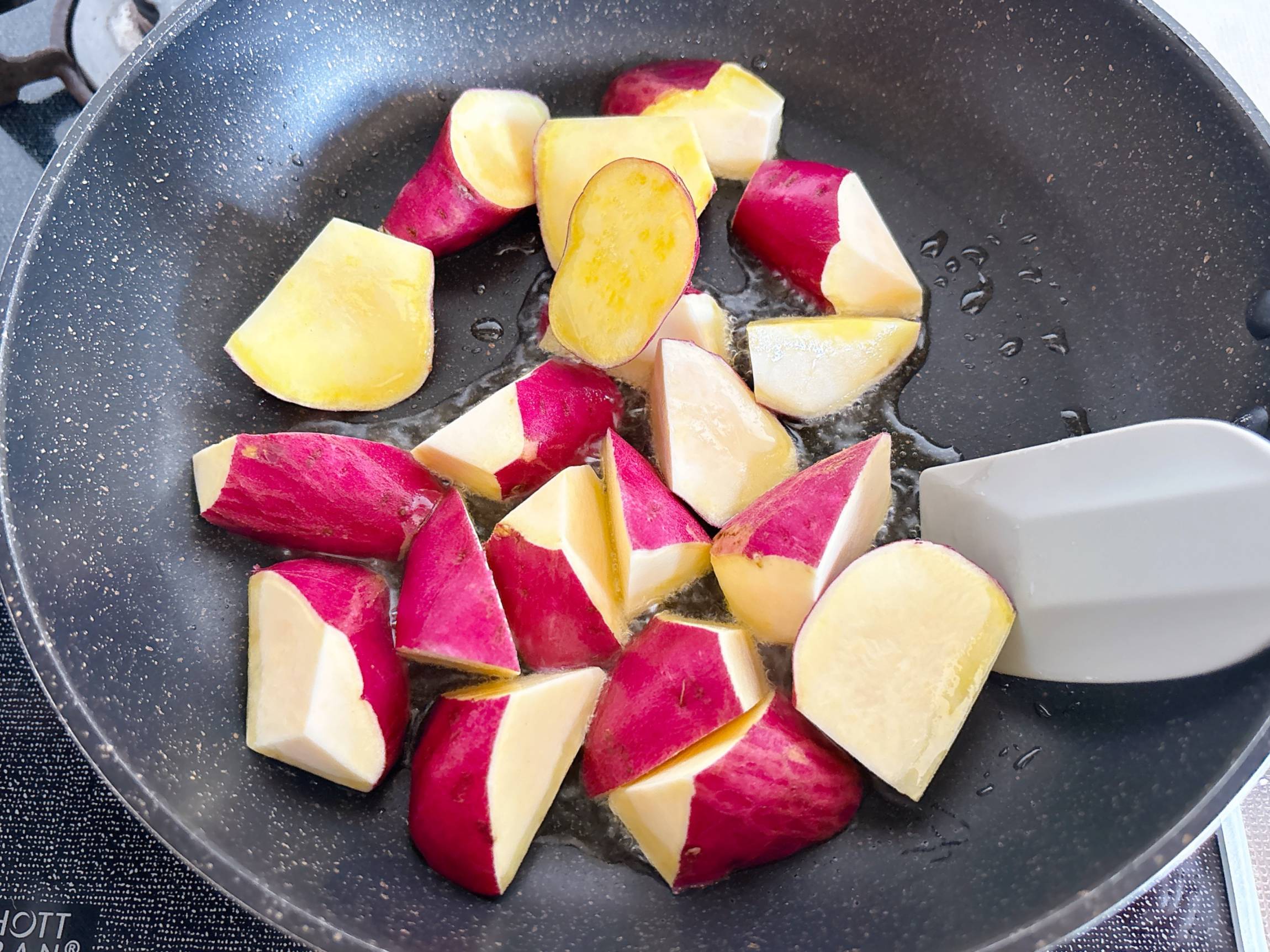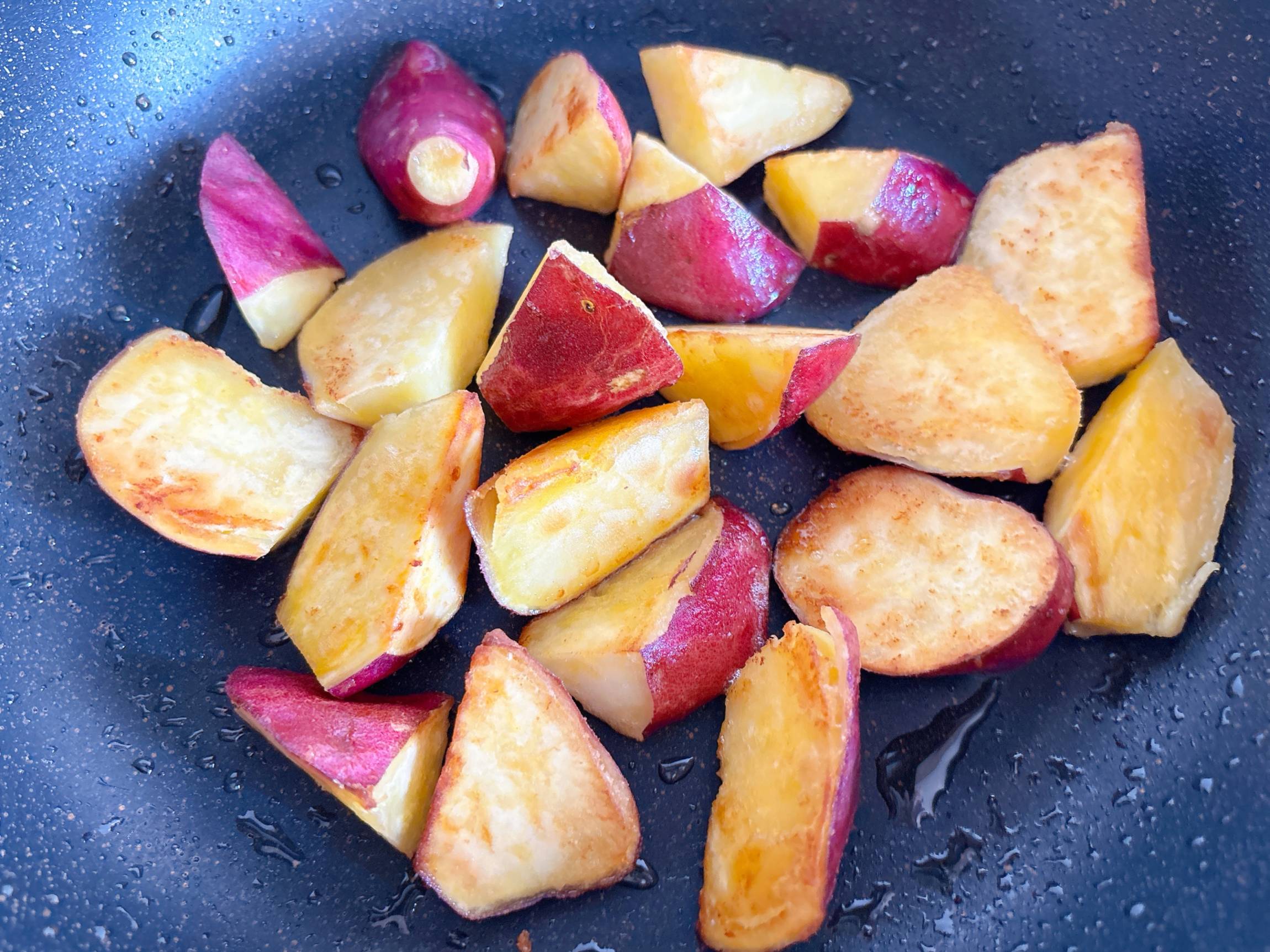 さつまいもは弱火で蒸し焼きにして火を通してから、強めの中火にして全体が色付くまで香ばしく焼くのがポイント。