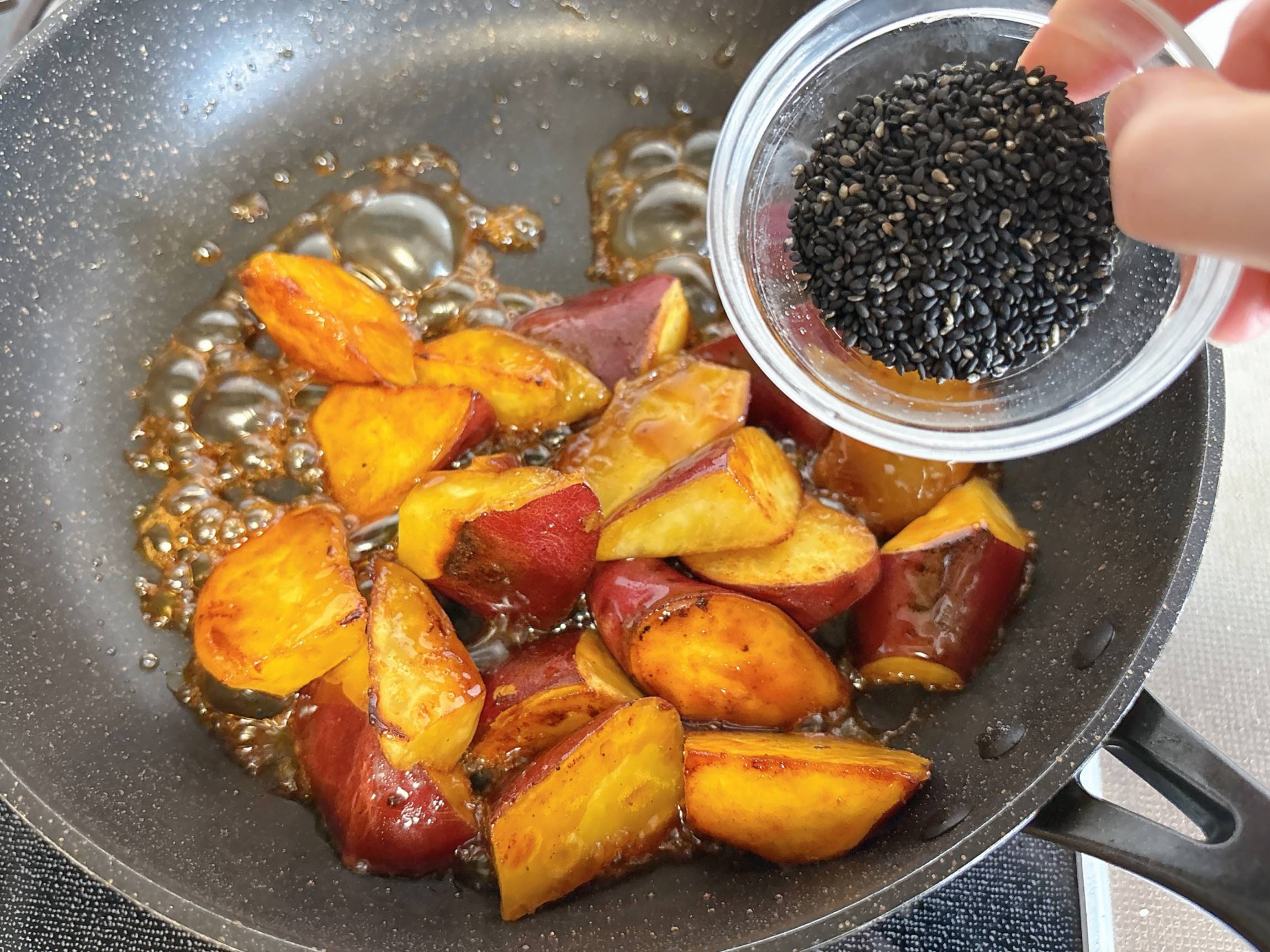 水気が飛んでさつまいもに火が通ったら、中火〜強めの中火にして香ばしい焼き色をつけてください。最後は強火だと焦げやすいので注意しましょう。