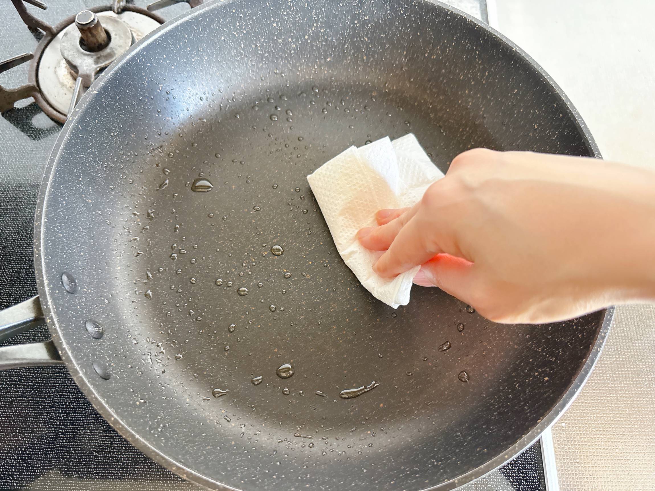 5分ほどおくとアクが抜け、えぐみを取り除けます。甘みが増して味付けが染みやすくなるという効果もありますよ。アク抜きをしたらキッチンペーパーで水気をしっかり拭き取りましょう。