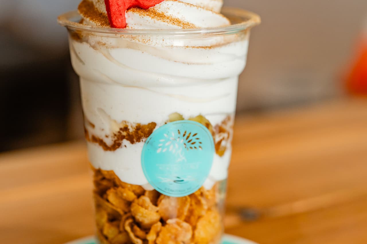 「SESOKOソフト」は、ナタデココとコーンフレーク、フルーツソースがたっぷりのったサンデー。ソースはマンゴー・イチゴ・チョコの3種類からカスタム可能です。