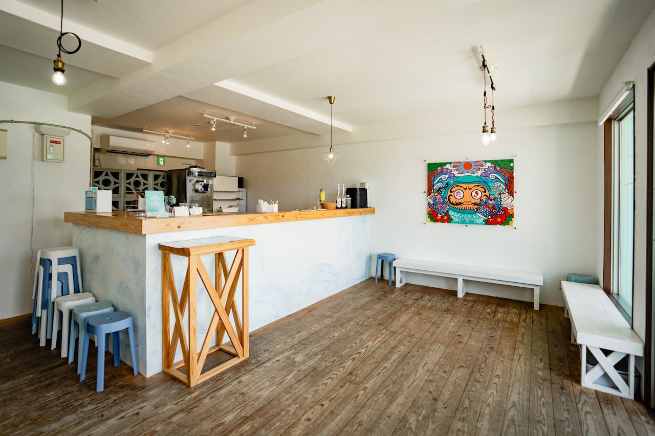 「SESOKO TABLE by TAKITA(セソコテーブルバイタキタ)」は、瀬底大橋を渡ってすぐ右手にあります。 アクアブルーを基調とした外観や窓の手描きの絵など、どれを切り取ってもかわいいデザイン。シンプルながらもセンスのよさが散りばめられています。
