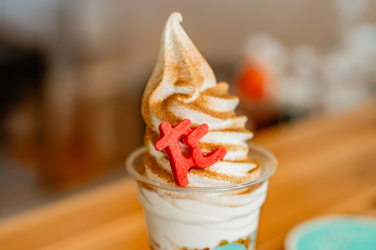 ナタデココとコーンフレーク、フルーツソースがたっぷりトッピングされた「SESOKOソフト」をはじめ、メニューは12種類以上。 さっぱり食べたい人には、さんぴん茶パウダーをたっぷりかけた「TAKITAソフト」や、屋我地島の塩を使った「おきなわ塩ソフト」がおすすめ。 甘いのが好きな人には「チョコバナナソフト」や生チョコとお餅の「生チョコ大福ソフト」、沖縄県産紅芋を使った「紅芋モンブランソフト」などもあります。 和菓子好きには「抹茶大福ソフト」や、ちんすこうと白玉・あんこ玉がのった「ちんすこうソフト」、シンプル派には「定番ソフト」「アフォガード」「ハチミツソフト」と、バリエーション豊かです。