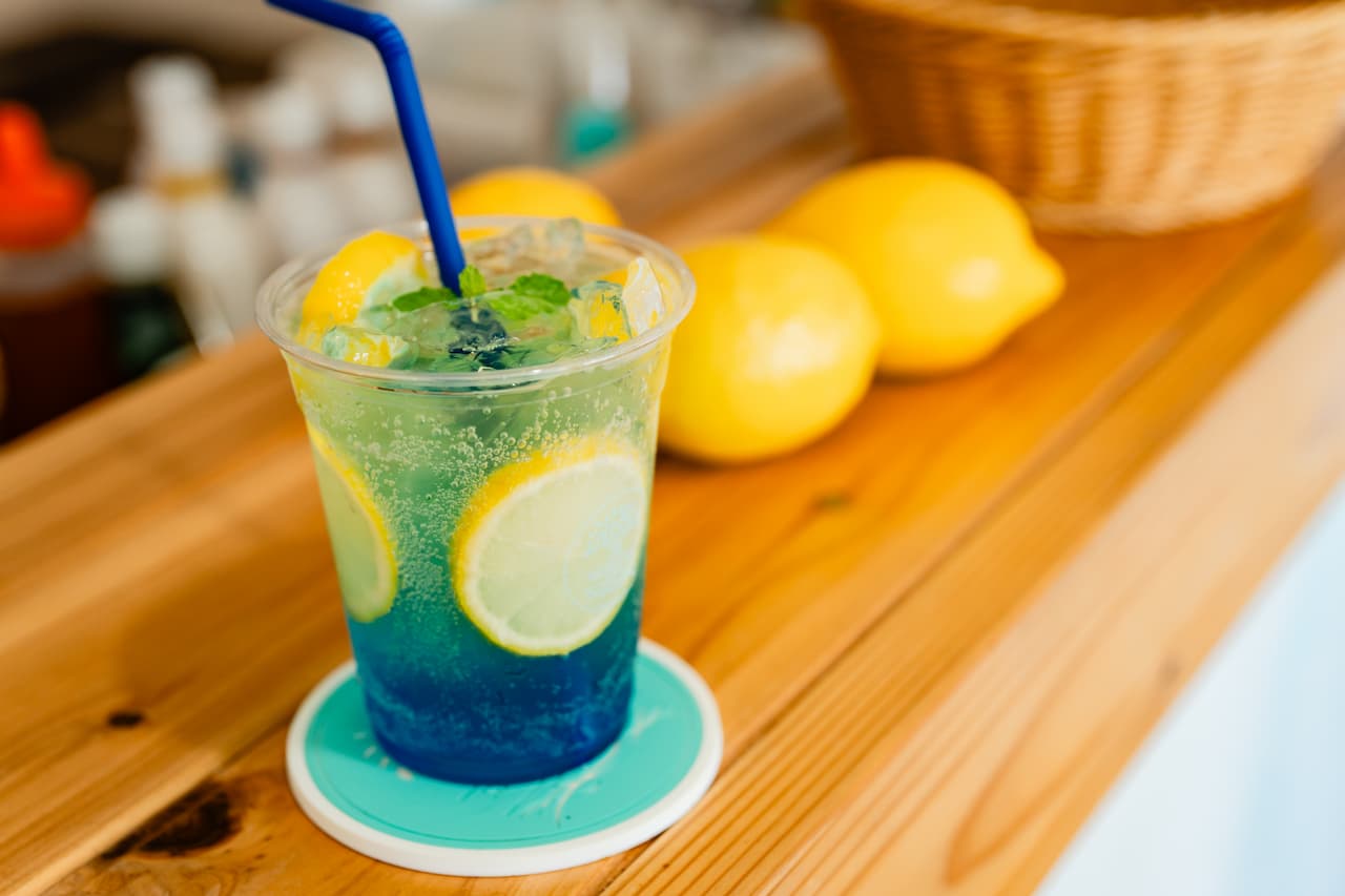 「Sesoko Blue」は、輪切りレモンとブルーオレンジシロップのレモネードソーダで、仕上げにフレッシュミントをのせています。甘さ控えめで、酸味と弾ける炭酸でつい一気に飲み干したくなるドリンクです。氷が溶けるとレモン水になり、レモンの酸味とほのかな甘さを最後まで楽しめます。 テイクアウトをするなら、飲んでいる途中で手持ちのお茶や水を足せば、最後まで味の変化を堪能できます。ぜひ余韻まで楽しんでみてください。