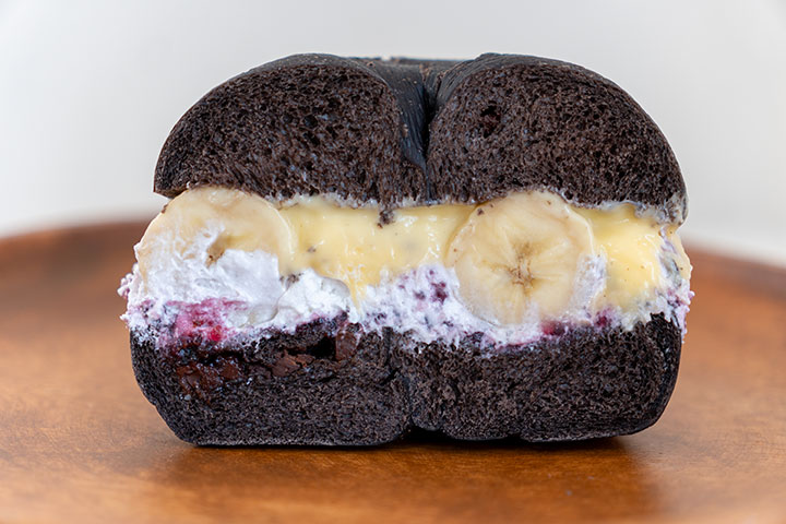 バナナ、カスタードクリーム、ブルーベリージャム、ブルーベリークリームを挟んだ満足感のある逸品です。