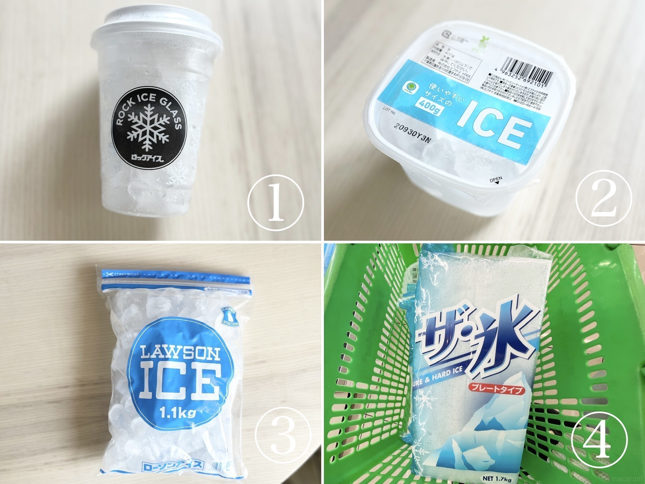 コンビニで買える氷は「グラス入りタイプ」「カップ入りタイプ」「袋入りタイプ」「板氷タイプ」の4種類。1〜3はかち割り氷(ロックアイス)が入っていて、パッケージや容量が異なります。